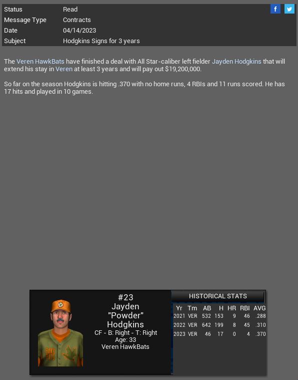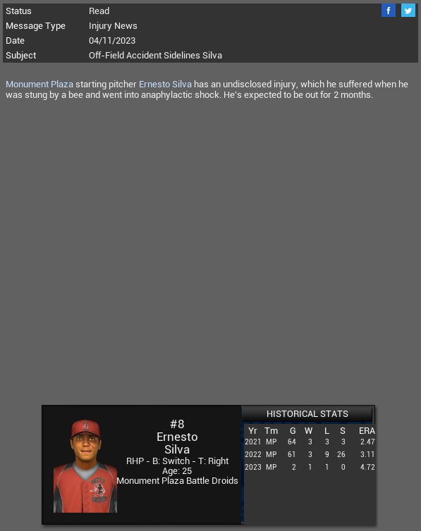 Willowbrook loses LF Kevin Grayer for 4-5 months. TIE Fighters Joe Foster gets a CG SH with 7 K vs Drager. Veren HawkBats sign CF Jayden Hodgkins to a 3 yr extension. Springfield Cardinals sign RP Cesar Cabrel to a 2 yr deal.