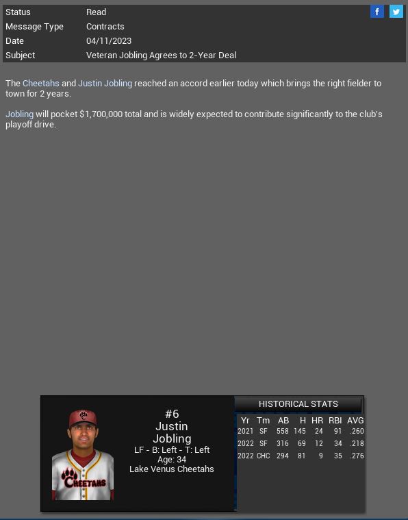 Lake Venus Cheetahs sign LF Justin Jobling to a 2 yr deal. NY Yankees LF Jeremiah Bernard goes 5-6 vs Detroit. Minotaurs RF Bartolo Rivera will miss an additional 3 weeks. Ford Thunderbirds sign LF Shoeless Joe Jackson to a 1 yr $3,000,000 deal. OF Logan Vick was demotes to AAA.