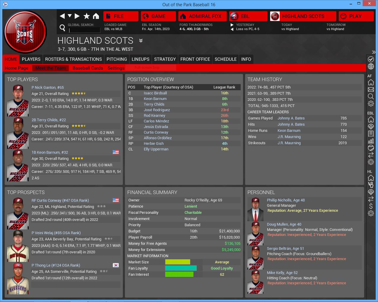 3 games vs Scots. They are 3-7 for a reason. They are not that good. They will probably lose 100 games especially with injuries to 2 P. Hackman & Conway are rookies. Barnum played for me in Anderson, so I do like him. Ganton is a decent SP, but better suited as a #3.