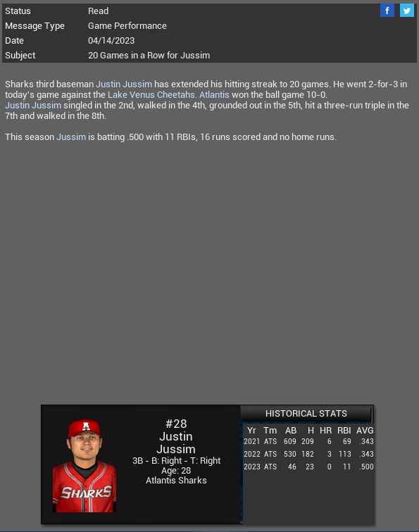 Justin Jussim hit streak stopped at 21 games.