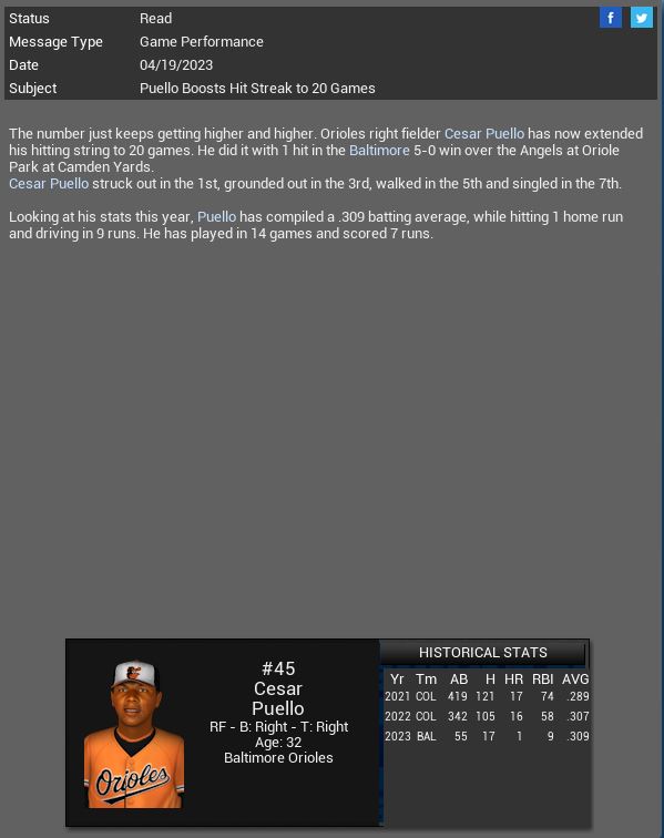 Orioles RF Cesar Puello has a 20 game hitting streak. Pittsburgh Pirates RP Ed Marshall will miss the rest of the season. Oakland A's sign C Mike Zunino to a 1 yr deal. Panasonic Dragons OF Brian Moore will miss the rest of the season.