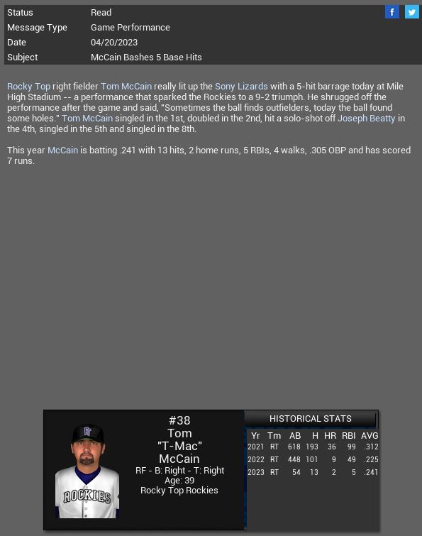 Veteran RF Tom McCain has a 5 hit game vs Sony.
