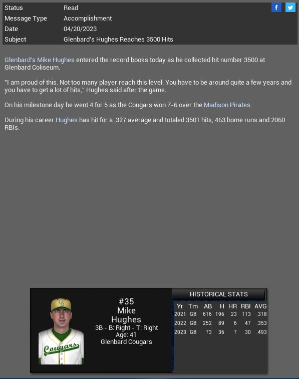 Mike Hughes becomes just the 2nd player with 3500 Hits. Bird City Falcons sign SP Jose Geraldo to a 7 yr contract extension worth around $21 million.