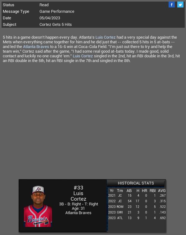 Atlanta Braves 3B Luis Cortez has a 5 hit game vs Mets.