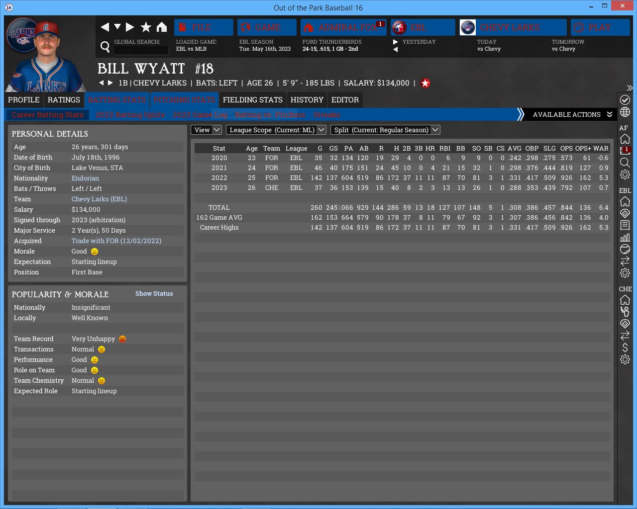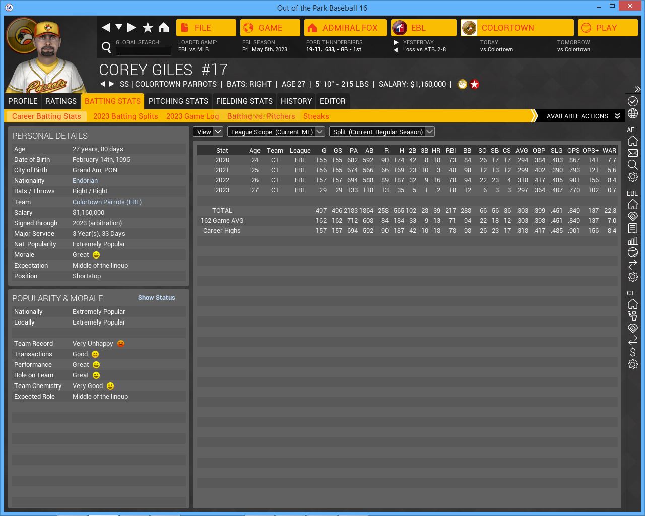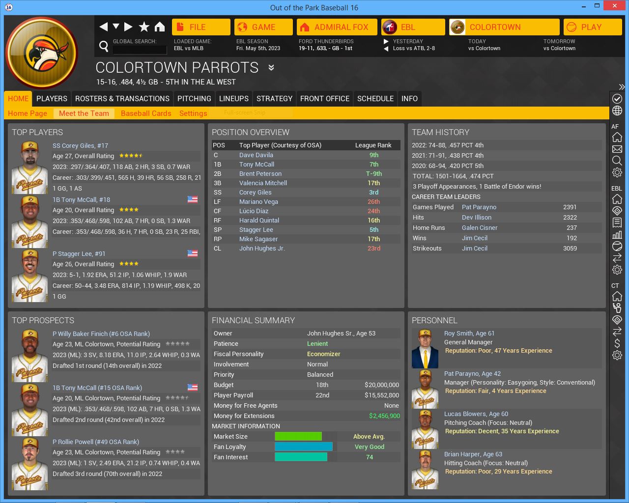 Some of us were here last year for the ASG but it will be our 1st visit to Cloud City as a team. Decent team but not the same without 3B Michael Peters hitting behind Escott. They are still a young team and have several good young prospects, namely Chance Calrissian, Lando's son. Durbin is a solid pitcher, surprised they moved Abraham Lincoln to the pen. He reminds me of Jamie Moyer. Despite the fact that they are 5 games under .500 they are one of 5 teams that can win the AL West.Whichever team wins the division should be around 90 wins.