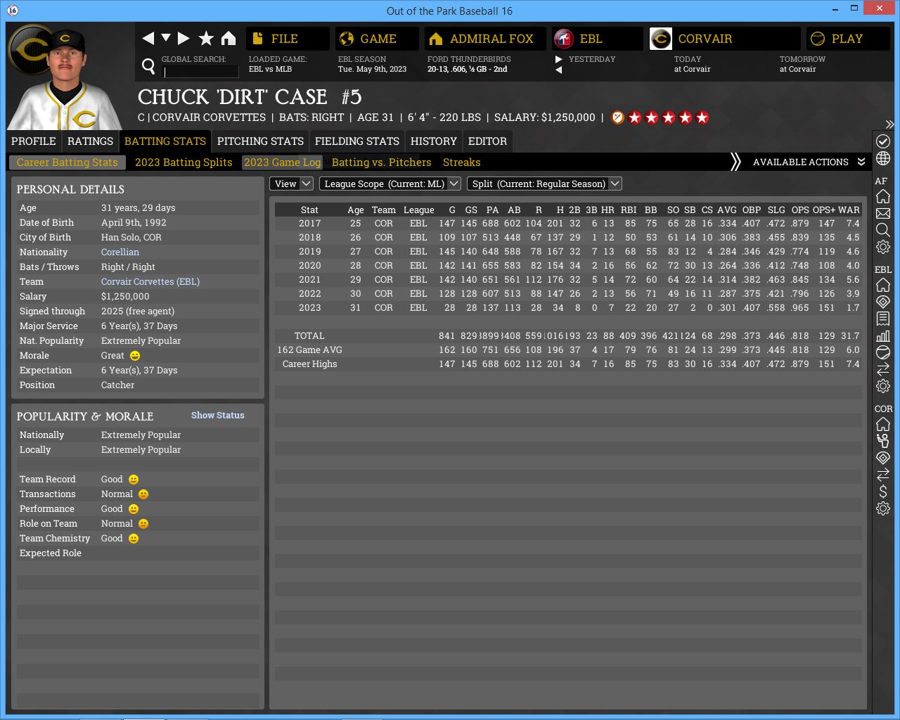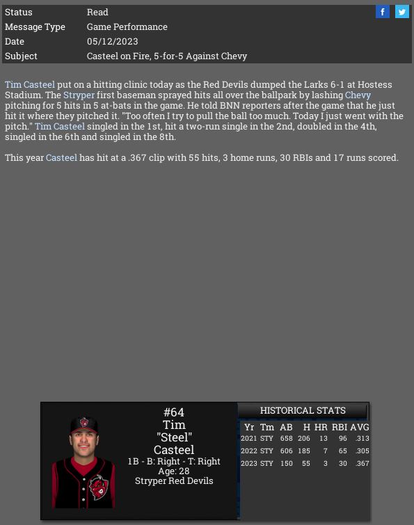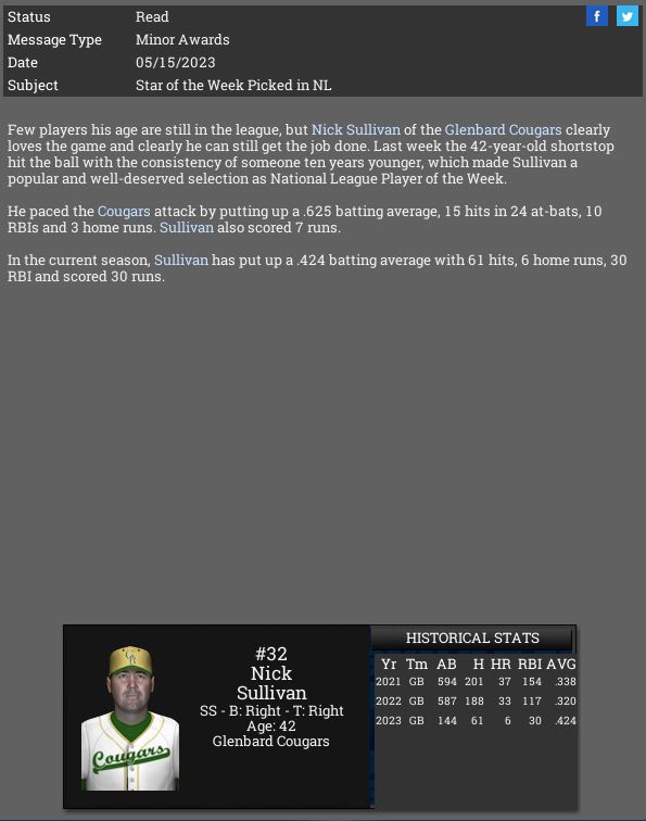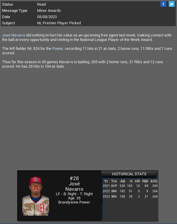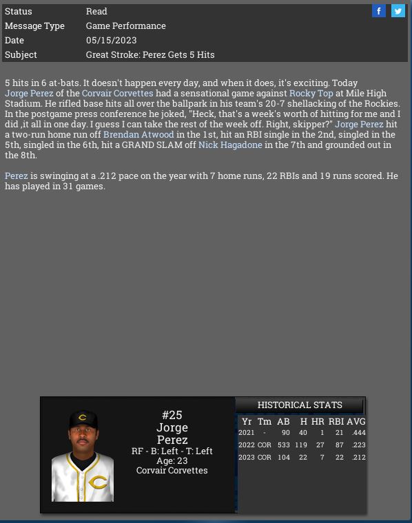 3-3 this week. We are a .500 team so far this month. Corvair took 2 of 3 from us. Not too worried about it so far. Screwball is a tough pitcher to get to and Jessica McClintock dominated us but we dominated James Jamieson. I sent over Jackson's re-sign paperwork to his agent, he should sign it within a week.