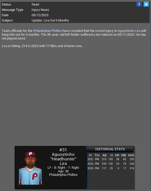 Phillies lose LF Aguostinho Lira for the season.