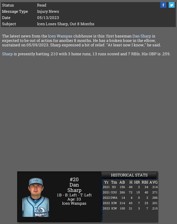 Icen loses 1B Dan Sharp for the season.