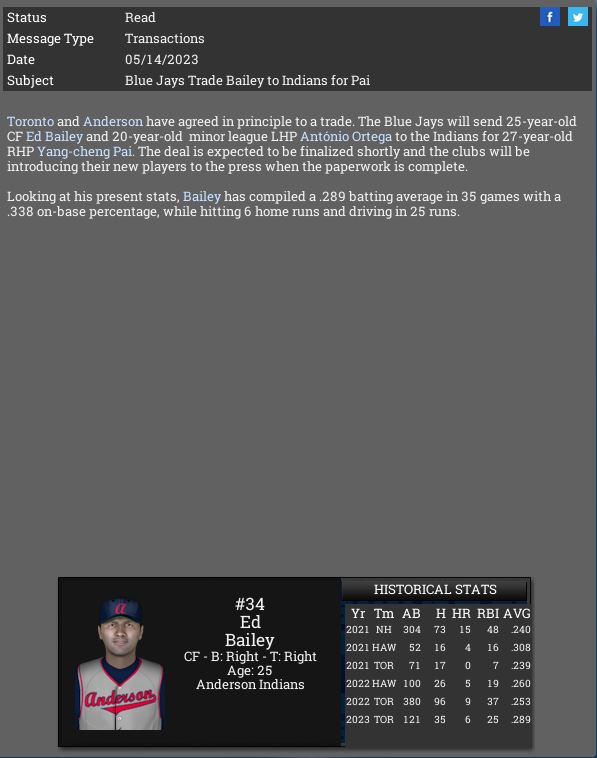 Toronto Blue Jays traded CF Ed Bailey & a minor league P to the Anderson Indians for P Yang-cheng Pai.