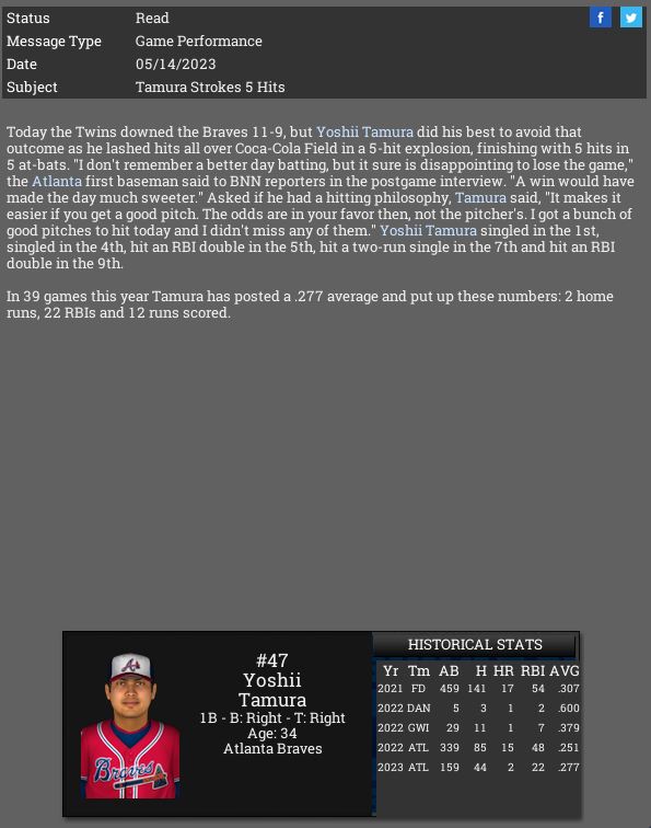 Atlanta Braves 1B Yoshii Tamura goes 5 for 5 vs Twins.