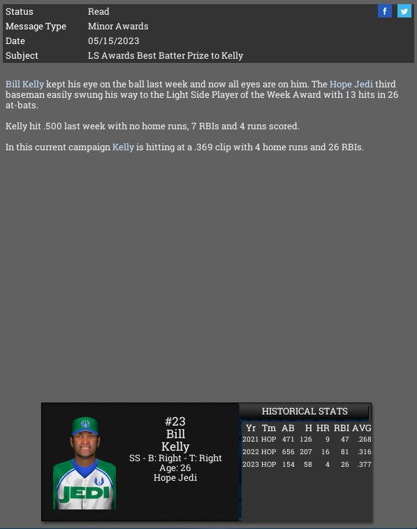 Hope Jedi SS Bill Kelly is named CBF LS POTW.