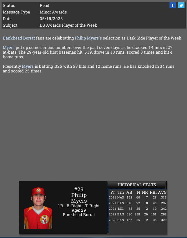 Borrat 1B Phillip Myers is named DS POTW.