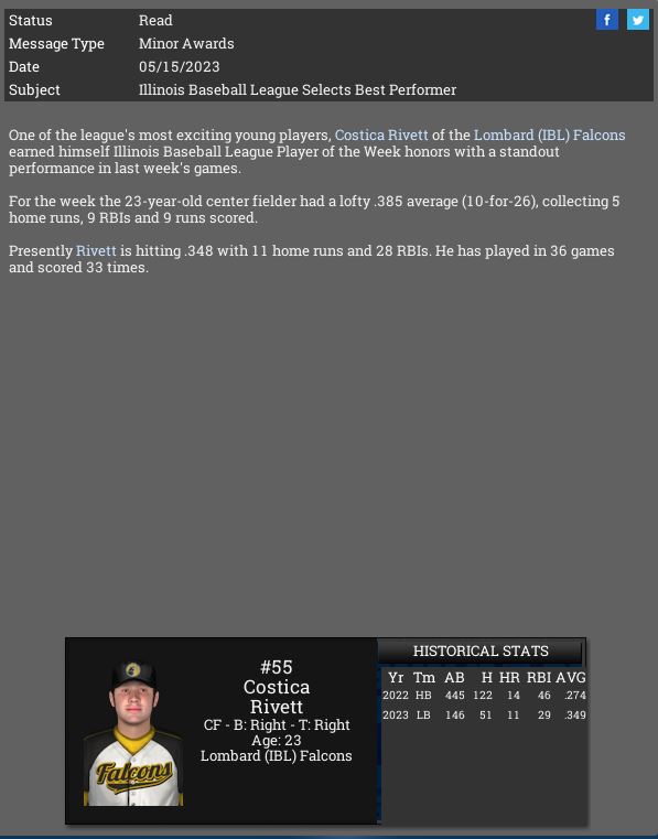 Lombard Falcons CF Costica Rivett is named IBL POTW.