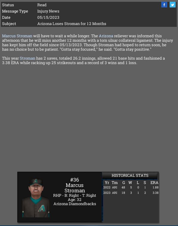 Arizona Diamondbacks lose RP Marcus Stroman for 12 months.