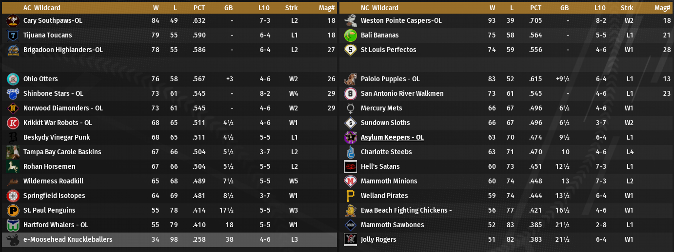 I've been having trouble reaching the forums the past two days. Anyone else having the same issue? Here are the OL Playoff B275 teams: Ciudad Trujillo Dragones (NC Central Division Champion) Brooklyn Untouchables (NC Wildcard) El Dorado Aztecs (AC Wildcard) The Aztecs had a tough Aug/Sep going 24-30 in that stretch. The Brooklyn Untouchables are very hot heading into the playoffs with an 8 game winning streak and 22-6 in September.