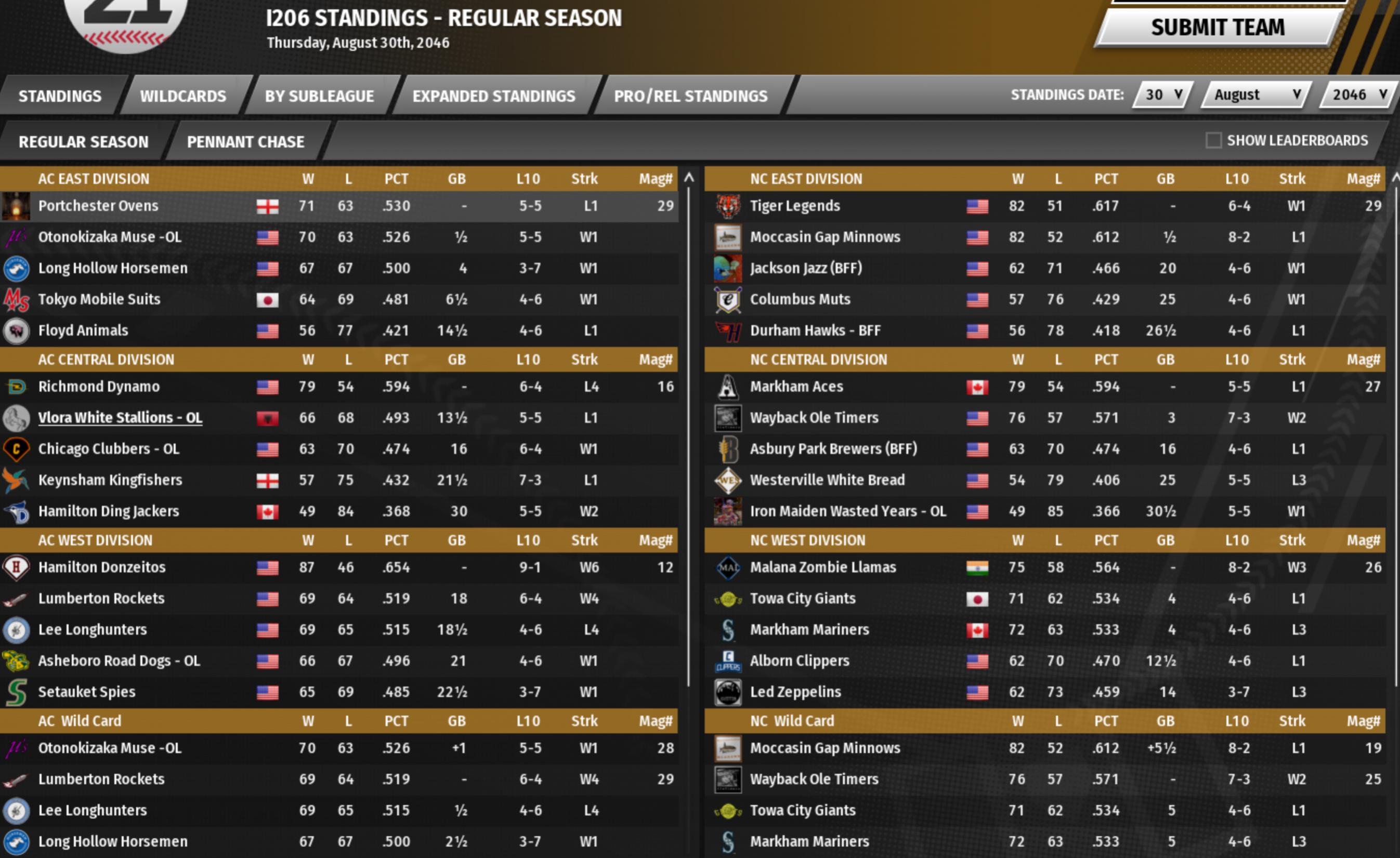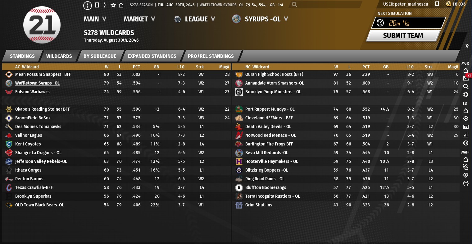 Port Ruppert moves into the lead heading into the stretch run. It's a wide open race with a number of teams within striking distance of claiming the crown. Overall, Annandale, Brooklyn and Waffletown each currently hold their respective division leads; with Port Ruppert, Death Valley and Norwood in a fierce wild card hunt in the NC. |