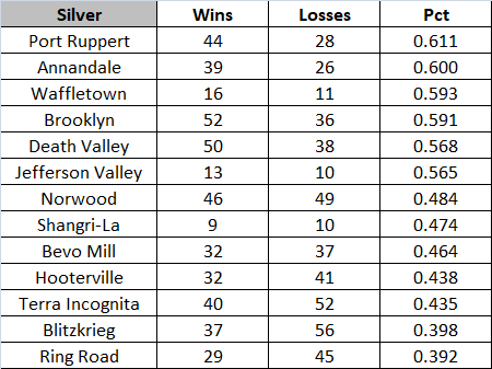 Annadale remains the lone OL team heading to the LCS as Port Ruppert wins their WC match but falls to the top seed in the LDS; while Waffletown chokes something fierce getting swept by a team they beat 13 of 19 in the regular season (no, I'm not bitter or anything )heading back in time to v20 to watch a Waffletown team that can actually play (heading to the Perfect tier LCS there) |
