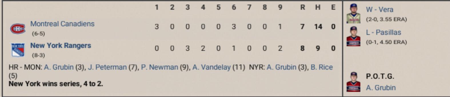 “Road wins, road wins — that’s the name of the game, Costanza!” Let me tell ya somethin’, I’ve been around this sport a long time. I’ve seen pucks fly, sticks break, coaches cry — and I’ve never in my life seen a series where NOBODY wants to win at home. You kidding me?! Home-ice advantage? Not in this series, baby! Five games — FIVE ROAD WINS! You’d think these teams were allergic to their own fans! THE RANGERS, THE RANGERS, THEY’RE DOING IT, COSTANZA! They go up to Montreal — Bell Centre, 48,000 screaming Habs fans — and what do they do? They drop a ten-spot on ‘em. That’s right, ten runs! KOSMO KRAMER! You see this guy?! Hits a homer in the first, double in the second, triple in the eighth — if he gets a single in the ninth, he’s hittin’ for the cycle! The man is a LUNATIC — and I LOVE IT! KOSMO KRAMER, COSTANZA! We tried to sign him back in ’97, but he said he was working on a coffee table book about coffee tables — whatever that means. Still hits like a freight train! Drives in three, scores three, wearing his helmet sideways, running like he’s chasing a bus — that’s baseball, baby! Er, hockey! AND HOW ABOUT THE START OF THIS GAME?! Top of the first: BAM — B. Rice goes yard! BAM — Kramer, two-run bomb! BAM — R. Torres joins the party! That’s five runs before Montreal’s even found their skates. You want a statement game? THAT’S A STATEMENT! You walk into the other guy’s house, eat his dinner, scratch up his hardwood floors, and take his dog for a walk. That’s what the Rangers did! Now listen, I’m not sayin’ Montreal didn’t fight back — no, no, no! They had 17 hits! Peterman hit a bomb, Newman went deep twice — twice! Vandelay had four hits, stole a base, filed some kind of export paperwork midgame. Still not enough! WHY? BECAUSE THE RANGERS WANTED IT MORE! Garza, Ochoa, Vera — even Menendez, who looked like he was pitching underhand — they held on! Vera with the two-inning save, cool as a cucumber. That’s what I like — ice in the veins, fire in the heart! And now, Game 6 goes to Madison Square Garden. You know what that means, Costanza? The Rangers are one win away. One win from the Stanley Cup Finals. One win from immortality! But don’t get too confident! Remember the trend: The road team wins every time! We’re better off playing this game in a parking lot in Schenectady! Now if you’ll excuse me, I have to go fire three assistant GMs, yell at a Zamboni mechanic, and redesign the commemorative towel giveaway. RANGERS WIN! RANGERS WIN! THAT’S BASEBALL— I MEAN HOCKEY— THAT’S RANGERS HOCKEY, BABY! |