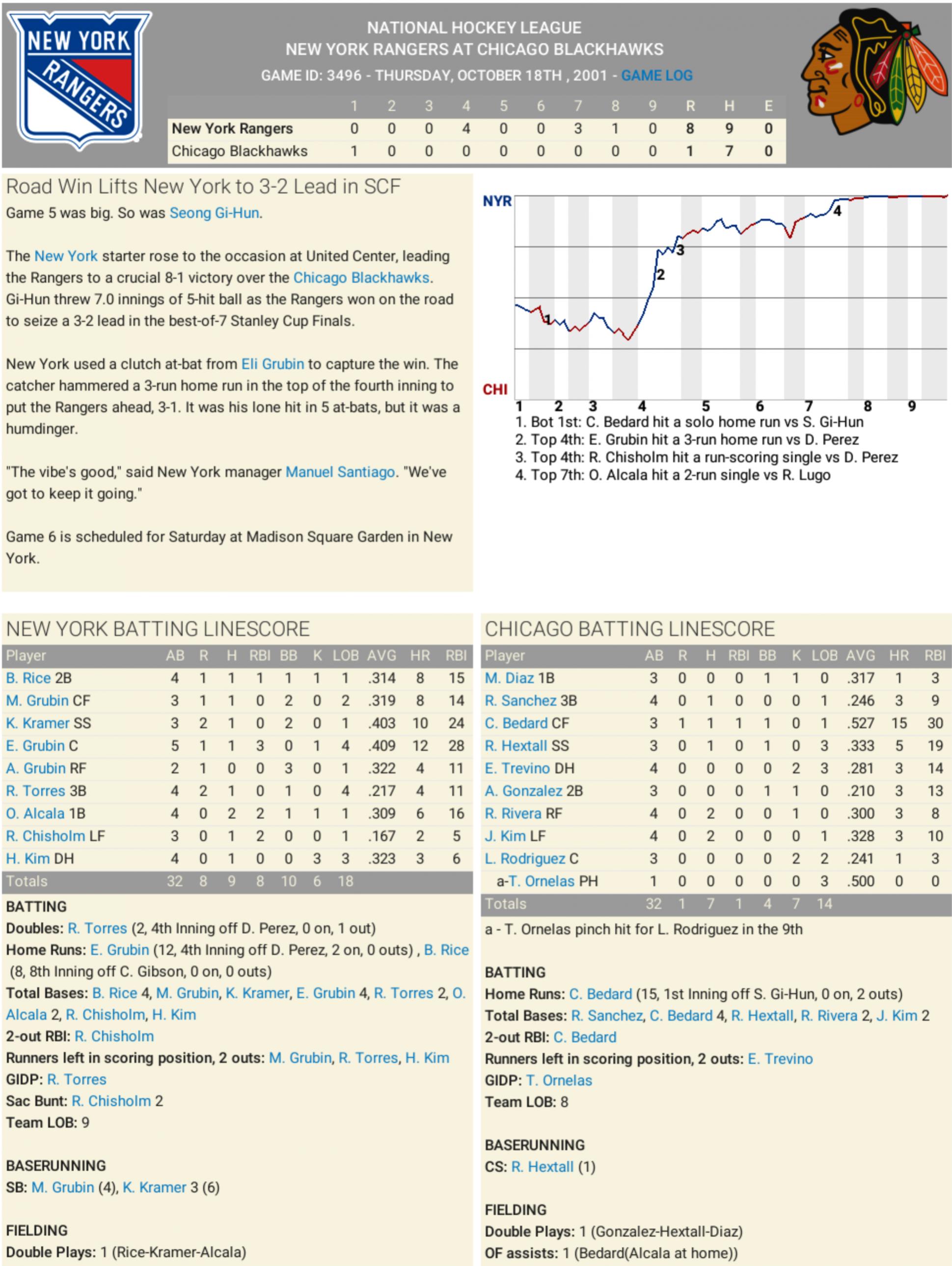 By Marv Albert (stylized commentary) | October 18, 2001 | United Center, Chicago Yesss!! A resounding road win for the New York Rangers as they go into the raucous United Center and silence the Chicago Blackhawks, 8 to 1, in Game 5 of the Stanley Cup Finals! The Rangers now take a commanding 3-2 lead in the best-of-seven series—and folks, they are just one victory away from hoisting Lord Stanley’s Cup for the tenth time in franchise history! And how about this performance from the ace of the New York staff—Seong Gi-Hun! Absolutely masterful on the mound tonight! Seven innings, five hits, just one run—and that came on a solo shot from Connor Bedard, who continues to be an unstoppable force. But outside of that—Gi-Hun was brilliant. Confident, composed, clinical. The Rangers gave him a lead and he ran with it like Clyde Frazier on a fast break! Now let’s talk about the big blow—the swing that changed the entire trajectory of this ballgame. Fourth inning, two men on... Eli Grubin steps up to the plate and—YESSS!! A towering three-run blast to deep left field! You could feel the oxygen leave the building as that ball took flight! That gave the Rangers a 3–1 lead, and they never looked back. Add a little Ben Rice power in the 8th, a solo shot to pad the lead—Yesss!—and mix in Octavio Alcala, Ruben Chisholm, Rafael Torres all chipping in, and you've got a Rangers lineup firing on all cylinders. Patient at the plate too—10 walks drawn on the night. That’s how you win on the road in October. And while we’re at it—tip of the toupee to the bullpen! Rafael Cora and Arturo Garza closed the door without so much as a peep from Chicago’s bats. That’s shutdown relief. Ice in the veins. As for Chicago, the story was missed opportunities and quiet bats. Yes, Connor Bedard did his usual thing with a solo homer in the first, but after that? Nada. Zip. Zilch. Just seven scattered hits, and only one extra-base knock. The rest was a parade of strikeouts, pop-ups, and frustration. So now, the series heads back to Madison Square Garden, where the Rangers will have a chance—a golden opportunity—to clinch the Cup in front of the home fans on Saturday night. Can they do it? Will this be the night Ranger fans have waited for? Will Gi-Hun’s gem go down in the annals of franchise lore? Find out next time... but for now, from Chicago... YESSSSSS!!! The Rangers are on the brink! |