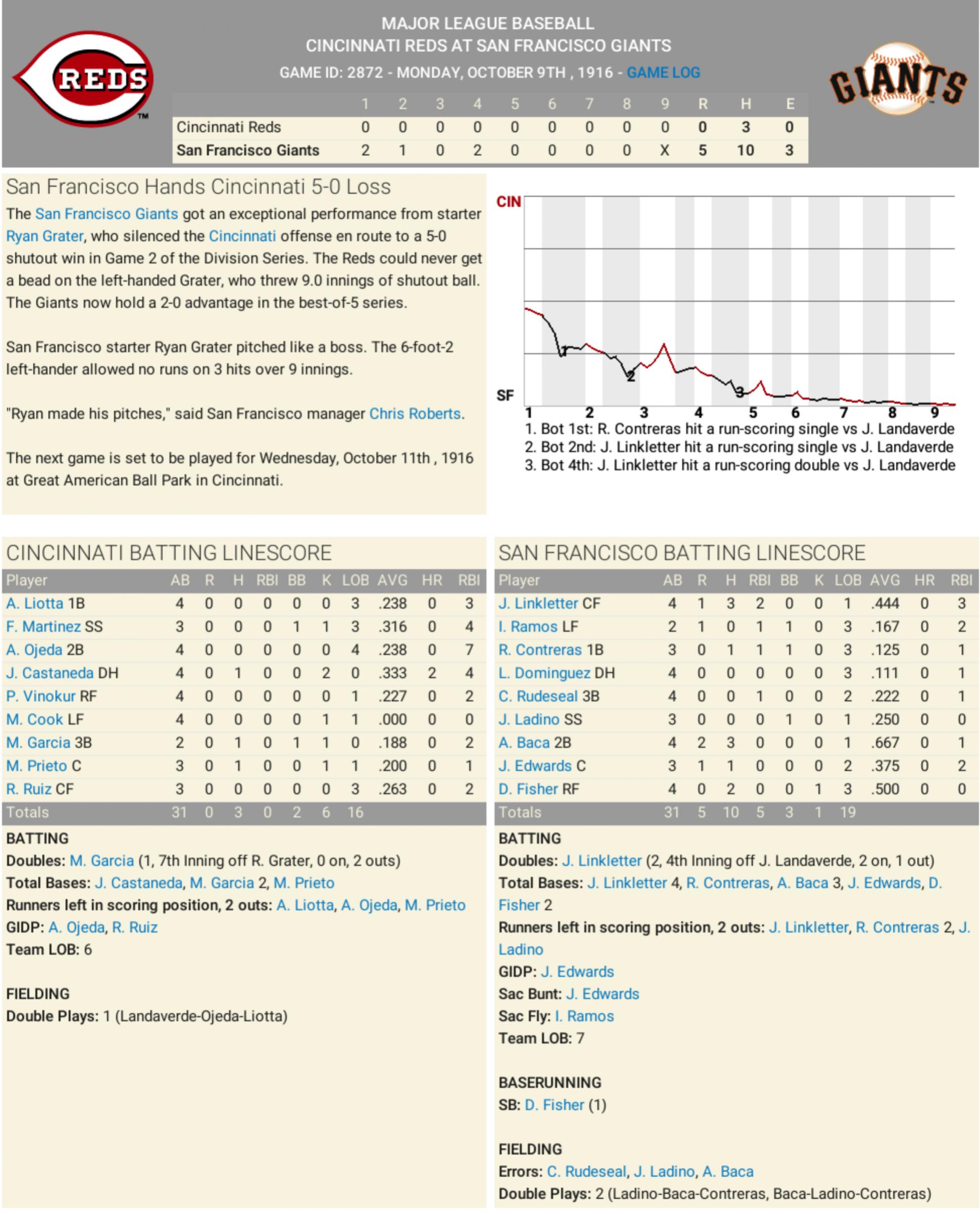 (as only Cerrano would say it) Giants beat Reds. Giants strong. Reds... no have enough marbles. CINCINNATI — The gods of baseball, they smile on San Francisco today. The mighty Giants, with hearts like lion, arms like thunder, and bats that speak truth, sweep the Reds and march on to National League Championship. Jobu is pleased. San Francisco win 2 to 1. Not big win. But big enough. When warriors go to battle, it is not about flash — it is about fire. Giants pitcher Vinny Luevanos, he have fire. Seven innings, five hits, no fear. Throws with courage. Throws with honor. He does not fear curveball. Then come Quintana — like blade in the dark. Two innings, no runs, only silence. Silence from Reds. Silence from crowd. Silence... is the sound of victory. The Reds — they try. They scratch. They fight. One run from Castaneda in the sixth. But it is like mosquito bite to rhino. Giants do not flinch. Alex Baca, he is man of series. He hits everything. Fastball? Hit. Slider? Hit. Change-up? Ha! Hit again. He bat .615. Jobu blesses his bat. Jobu makes it gold. Cerrano sees many things in this game. He sees Dominguez swing hard like tree falling. He sees Rudeseal run like jaguar. He sees Contreras, Ramos, Fisher — all play like men who believe. Like men who know they go to next battle. Reds... they look confused. They bring bats, but forget the thunder. They bring gloves, but forget the fire. Jobu cannot help them. Cerrano cannot help them. No one can help them. They are swept. Like dust. Like crumbs. Gone. Now Giants wait. They wait to fight next challenger — Pirates or Phillies. Cerrano says it don’t matter. When team have honor, when team have Jobu on shoulder — team is ready. Giants go to NLCS. Giants make fire. Giants drink rum. Baseball is strange game. But today, it was beautiful. Giants win. Jobu approves. |