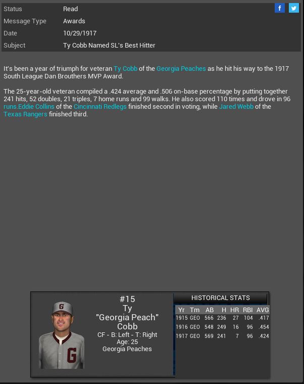SP Christy Mathewson, PHI SP Walter Johnson, TEX 2B Eddie Collins, CIN CF Ty Cobb, GEO SS Johnny Evers, CLE 3B Justin Powers, BOS SP Will Douglas, BOS MR Heinz Klah , BRO SS Joe Forrest, BRO C Preston Lyons, CHA LF Lanzo Canonicca, CHA MR Charles Adams, CHI 1B Tim O'Keefe, CHI CF John Walker, CIN SS Pat Beard, CLE MR Danny Rice, DET 3B Ben Thomas, DET 2B Noah Barfoot, GEO SP Craig Sutton, HOU CF Kai Rudder, HOU SP James Brady, LOU SS Roy Dudley, LOU SP Dallas Burks, NAS 1B Marc Gunn, NAS SP Todd Morris, NY SP Michael Smith, NY SS William Roebuck, PHI C Ed Stice, STL LF Ralph Gibson, STL 2B Mac Tipton, TEX 3B Kelly Thompson, WAS SP Robert Lee, WAS