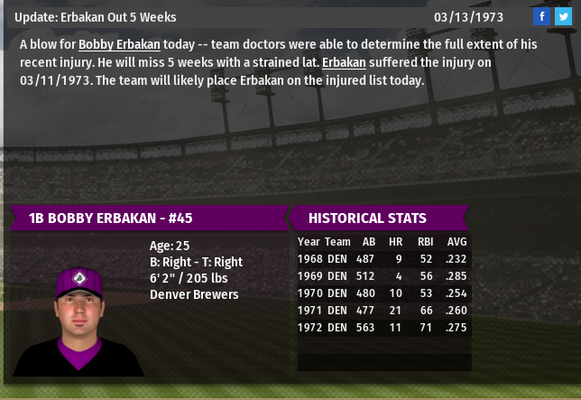 Bobby Erbakan, who in the first week of the 1973 Spring Training exhibition schedule was off to one of the best starts on the team (.417/.500/.833), sustained a back strain while running the bases in Sunday's 3-2 victory over the San Francisco Velocity.