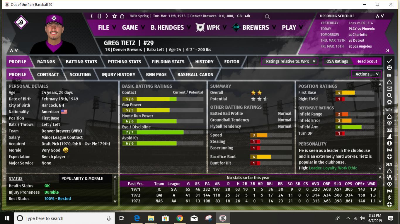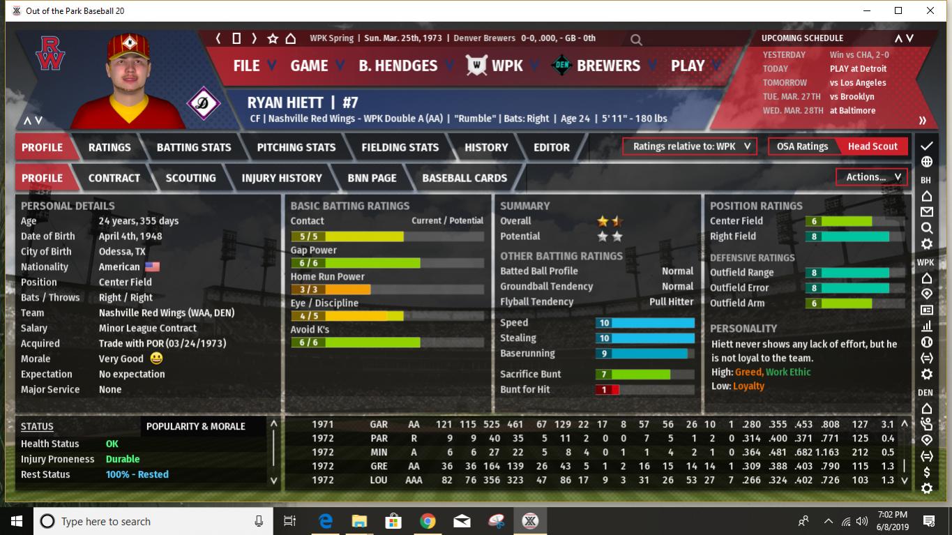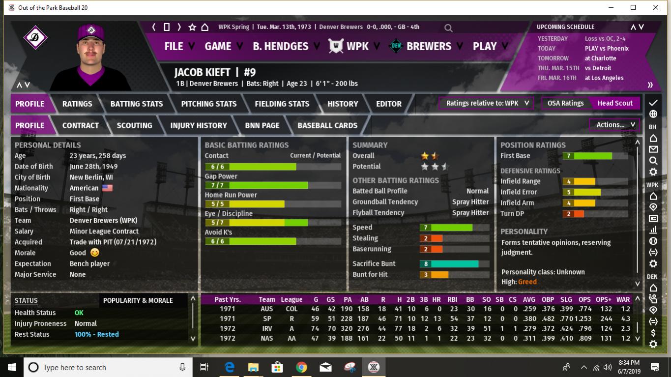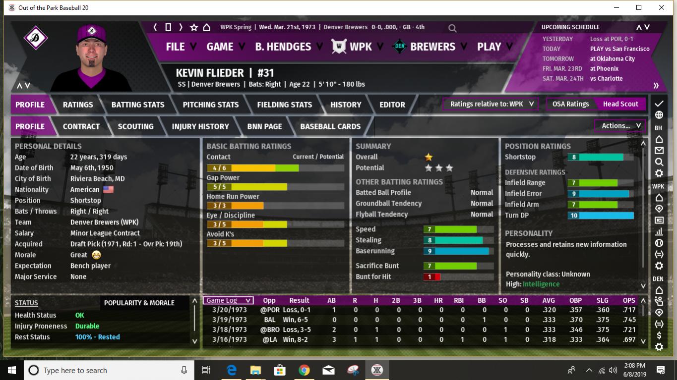 First of all, I believe I've mentioned in the past that before each season starts I use an analog process to determine what MLB season the WPK statistical modifiers will be based upon. I use a 20 season range from 1972 to 1991. This provides 2 chances out of 20 for an outlier statistical season- 1972 on the low offense, great pitching side and 1987 on the high offense, lots of HR's side. Up to now the WPK has leaned a bit more to the low offensive output end of the spectrum, with a few seasons being positively pitching dominated. When I rolled the 20-sided die last night to determine what 1973 would look like I rolled a 16. Which means the WPK will look something like 1987 MLB statistically this season. This should be interesting. What does it mean for the Brewers? Well, for a few Brewers it could definitely mean trouble. I would expect that this is the year Harry Lyerly's poor movement rating catches up with him. It could be a long year for poor Harry, especially as the pre-season projections/predictions seem to indicate that the offensive ramp up will be greater in the MGL than in the SJL. And heaven help him when he faces the Phoenix Speed Devils, who have several lefthanded power hitters in the middle of their lineup (they are projected to hit over 200 HR's as a team in 1973.) A few other Brewer pitchers also could have some long ball issues. Steve Green, in spite of having a fine movement rating, has shown a propensity to give up HR's in the past and it will be interesting to see how it works out for him this year. And while the Brewers have a few young players who are starting to show signs of developing power- Joe McPhillips and Jonathan Koch, in particular, though Mike Foster could chip in with double digits as well- overall we are not a power hitting club. Pre-season predictions (I will post the details later) do show the Brewers with the highest batting average in the MGL, and a pretty average number of runs scored. And we do have a number of good gap hitters with speed, so if we can even just achieve a slightly below average number of HR's, we could compete. Our pitching is predicted to remain near the top. Spoiler alert: the pre-season predictions have Denver finishing 3rd, with 90 wins. If I am understanding correctly how this works in the game, this is likely without factoring in one of our most valuable players- Bobby Erbakan, who is currently on the IL. On the other hand, the predictions show our one hitter among the top 10 in the league being Andrew Kennedy, who is currently the starter at first in place of Erbakan. I have always been high on Kennedy and consider him probably our best pure hitter so I will try to get him plenty of playing time once Erbakan returns. It's a good problem to have, but the challenge is fitting in Erbakan, Kennedy, and Ryan Rodgers into essentially two spots on the diamond. Rodgers can still play a decent center field so he will probably spell youngster Joe McPhillips there quite a bit so that Kennedy gets enough time in left when he's not giving Erbakan a day off at first. Kennedy is also okay in right, but with the addition of Cesar Grajeda and what with trying to ensure Pat Rondeau gets some playing time, this doesn't help much. I expect the Brewers to compete again this season. Can we reclaim the top spot in the MGL? Impossible to say right now. So much will likely depend upon injuries, especially as some of our close competitors do have some key players who are injury prone. I would stack our starting rotation up against anyone's in the league- even with the possible Lyerly issue this season- and our bullpen is solid if not spectacular. Not as good as the Phoenix bullpen and maybe 1 or 2 others, but better than most. Our defense should once again be among the best in the league, especially up the middle. (Jonathan Koch looked particularly impressive in the pre-season and if he can hit enough to hold on to the starting job, we should be better up the middle than ever. And with the amazing Oscar Vargas once again providing backup at second, short, and third, we have late inning coverage that is nearly unparalleled.) Our offense will get on base- with good batting average and OBP skills. We will hit plenty of extra base hits. Just not so many that clear the fence. We have decent team speed, but we aren't expected to be at the top in stolen bases like we used to be in earlier years. I think we can win the MGL, but I anticipate it being a tight race. The Los Angeles Spinners are the pre-season favorite, with the power-hitting (and dominant bullpen) Phoenix Speed Devils ranked next. It should be fun. And it all starts later tonight! Last edited by BirdWatcher; 06-10-2019 at 05:06 PM. |