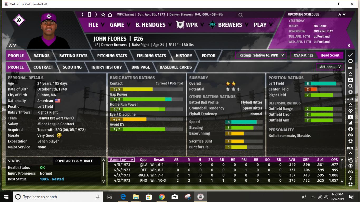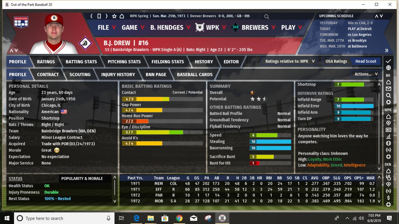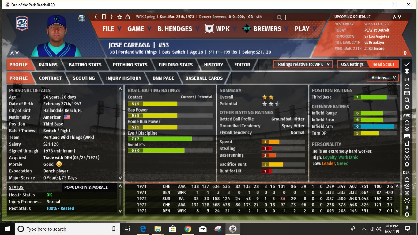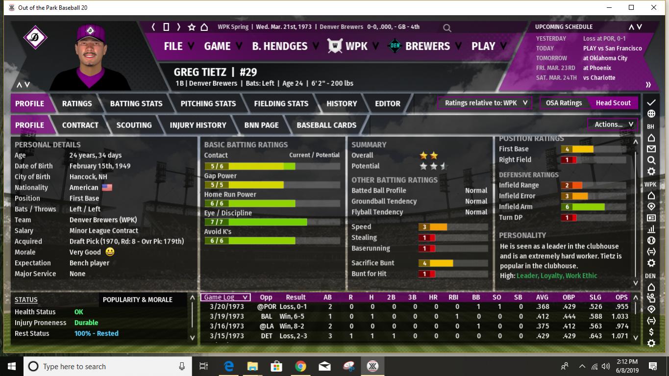 First of all, I believe I've mentioned in the past that before each season starts I use an analog process to determine what MLB season the WPK statistical modifiers will be based upon. I use a 20 season range from 1972 to 1991. This provides 2 chances out of 20 for an outlier statistical season- 1972 on the low offense, great pitching side and 1987 on the high offense, lots of HR's side. Up to now the WPK has leaned a bit more to the low offensive output end of the spectrum, with a few seasons being positively pitching dominated. When I rolled the 20-sided die last night to determine what 1973 would look like I rolled a 16. Which means the WPK will look something like 1987 MLB statistically this season. This should be interesting. What does it mean for the Brewers? Well, for a few Brewers it could definitely mean trouble. I would expect that this is the year Harry Lyerly's poor movement rating catches up with him. It could be a long year for poor Harry, especially as the pre-season projections/predictions seem to indicate that the offensive ramp up will be greater in the MGL than in the SJL. And heaven help him when he faces the Phoenix Speed Devils, who have several lefthanded power hitters in the middle of their lineup (they are projected to hit over 200 HR's as a team in 1973.) A few other Brewer pitchers also could have some long ball issues. Steve Green, in spite of having a fine movement rating, has shown a propensity to give up HR's in the past and it will be interesting to see how it works out for him this year. And while the Brewers have a few young players who are starting to show signs of developing power- Joe McPhillips and Jonathan Koch, in particular, though Mike Foster could chip in with double digits as well- overall we are not a power hitting club. Pre-season predictions (I will post the details later) do show the Brewers with the highest batting average in the MGL, and a pretty average number of runs scored. And we do have a number of good gap hitters with speed, so if we can even just achieve a slightly below average number of HR's, we could compete. Our pitching is predicted to remain near the top. Spoiler alert: the pre-season predictions have Denver finishing 3rd, with 90 wins. If I am understanding correctly how this works in the game, this is likely without factoring in one of our most valuable players- Bobby Erbakan, who is currently on the IL. On the other hand, the predictions show our one hitter among the top 10 in the league being Andrew Kennedy, who is currently the starter at first in place of Erbakan. I have always been high on Kennedy and consider him probably our best pure hitter so I will try to get him plenty of playing time once Erbakan returns. It's a good problem to have, but the challenge is fitting in Erbakan, Kennedy, and Ryan Rodgers into essentially two spots on the diamond. Rodgers can still play a decent center field so he will probably spell youngster Joe McPhillips there quite a bit so that Kennedy gets enough time in left when he's not giving Erbakan a day off at first. Kennedy is also okay in right, but with the addition of Cesar Grajeda and what with trying to ensure Pat Rondeau gets some playing time, this doesn't help much. I expect the Brewers to compete again this season. Can we reclaim the top spot in the MGL? Impossible to say right now. So much will likely depend upon injuries, especially as some of our close competitors do have some key players who are injury prone. I would stack our starting rotation up against anyone's in the league- even with the possible Lyerly issue this season- and our bullpen is solid if not spectacular. Not as good as the Phoenix bullpen and maybe 1 or 2 others, but better than most. Our defense should once again be among the best in the league, especially up the middle. (Jonathan Koch looked particularly impressive in the pre-season and if he can hit enough to hold on to the starting job, we should be better up the middle than ever. And with the amazing Oscar Vargas once again providing backup at second, short, and third, we have late inning coverage that is nearly unparalleled.) Our offense will get on base- with good batting average and OBP skills. We will hit plenty of extra base hits. Just not so many that clear the fence. We have decent team speed, but we aren't expected to be at the top in stolen bases like we used to be in earlier years. I think we can win the MGL, but I anticipate it being a tight race. The Los Angeles Spinners are the pre-season favorite, with the power-hitting (and dominant bullpen) Phoenix Speed Devils ranked next. It should be fun. And it all starts later tonight! Last edited by BirdWatcher; 06-10-2019 at 05:06 PM. |