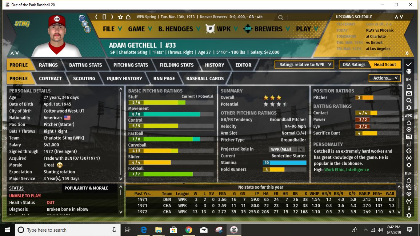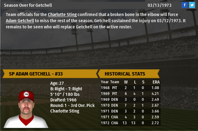 Very bad news today for WPK reigning champs, the Charlotte Sting, as Adam Getchell, one of the key members of their 1972 starting rotation, has been lost for the season before it even starts.