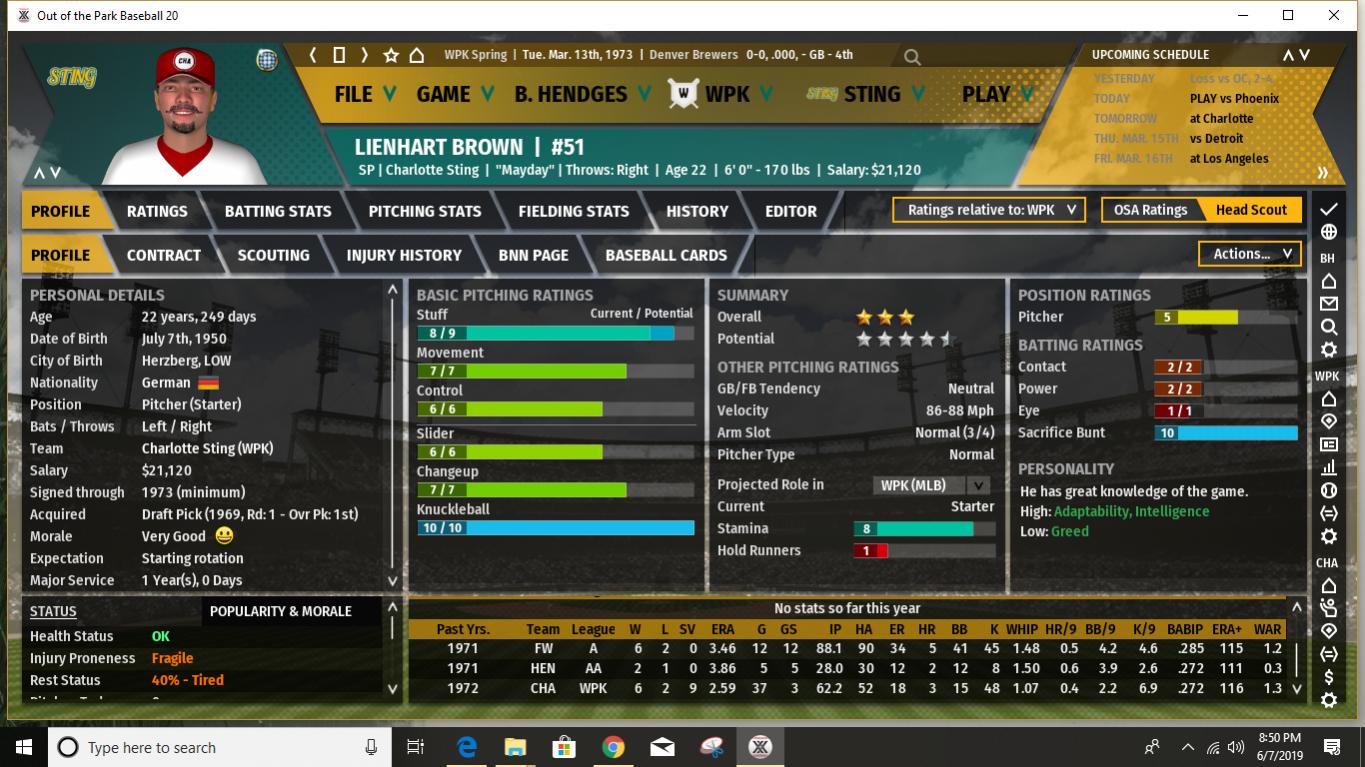 The nearly 28-year old former Brewer has the reputation of being a durable pitcher but a freak collision on the base paths left him with a broken bone in the elbow of his pitching arm and it is expected to take 8-9 months for him to recuperate sufficiently to return to action. The good news for the Sting is that they have a deep and talented rotation. Much will depend though on the ability of former first round pick (#1 overall in 1969 draft) Lienhart Brown's to remain healthy (fragile) as well as 4th starter Dean Olson to do the same (also fragile.) |