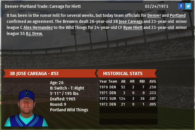 Careaga was at one time one of the Brewers better prospects in spite of having been a 9th round draft pick in 1965. He had several minor league seasons where he put up impressive offensive numbers. He has since been surpassed by Mike Foster and with several other decent third base options in the organization, including reliever Jordan Stephens, it was time for Careaga to be given a chance to catch on elsewhere. The rebuilding Portland Wild Things is a good place for him to possibly contribute. With aging and fragile superstar Andy Wilson expected to play third for the Wild Things- and with highly questionable defensive skills- Careaga will likely get plenty of opportunities to play in 1973. Hernandez was similarly a prospect who had been surpassed and was trapped at AAA, where he was quite unhappy. Neither Hiett nor Drew are expected to ever play key roles in Brewers uniforms but they still have minor league options and could eventually play into bench roles in the future. |