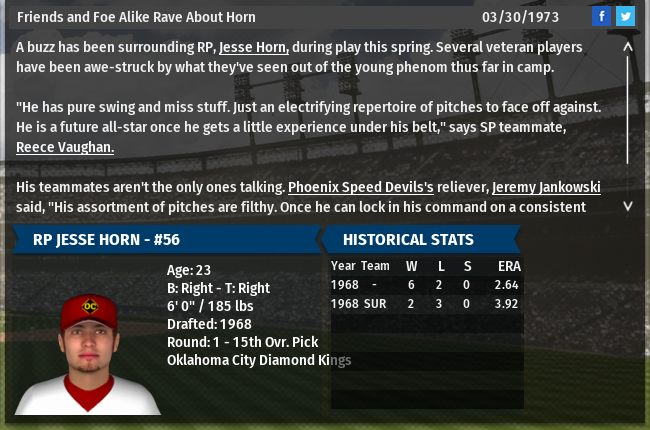 It's not often that a rookie reliever creates a stir in a city before he's even pitched a single inning of big league ball, but such is the case in Oklahoma City with 23-year old righty Jesse Horn. Granted, the Diamond Kings haven't finished above 7th place the past 3 seasons so they might be looking for any ray of hope they can find.