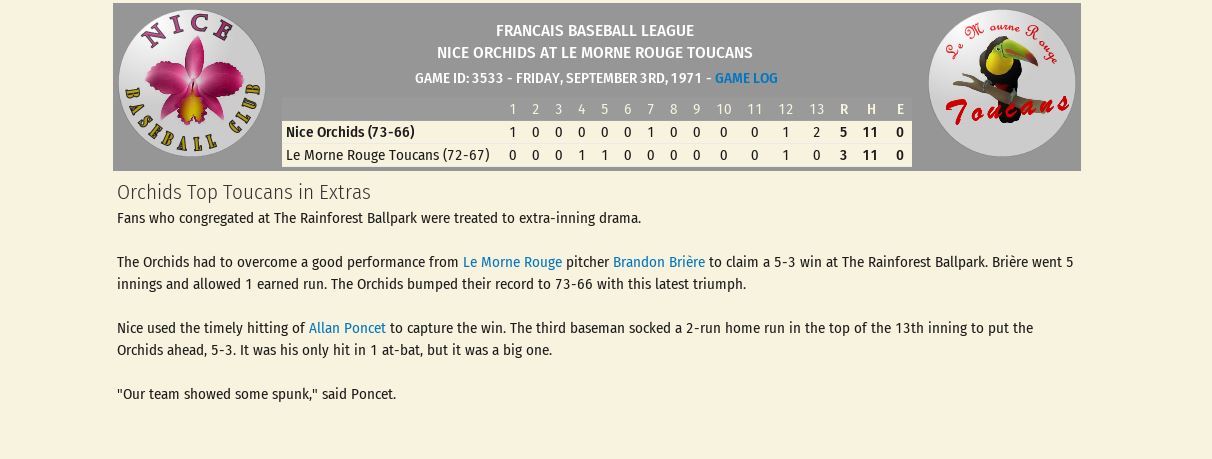 The Orchids refuse to cool down as they handed Julien Henri the L in the series opener.  It was Nicolas Fontaine, the 23 year old RHP from Sainte Phillipe, Martinique, who stole the show with his 6 innings of one run ball.   Fontaine, with a 5.49 ERA in 41 IP during the regular season, used 5 different pitches to befuddle the potent Artist attach allowing just 4 hits. In Le Diamant, it was the Expedition who won on the road as they scored 4 late runs to rally for a 6-3 win. Xavier Rolland went deep for Ottawa.