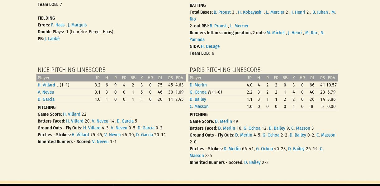 The series is going the distance.  The Nice Orchids entered Arc de Triumph ballpark and took control early.  The bats were big, as were the timeliness of the hits. Some Key points to the game/series: Paris SP Sam Smith was battered for the second time in the series. He walked two, yielded 8 hits, and allowed 5 runs to score without finishing the 4th inning. Mathieu Michel, LF, has been untypically cold. He's batting .276 but his slash line is .276/.300/.379. Julien Henri is hitting .421. Herve Delage has 5 hits the last 3 games but is still batting only .217. Look for Julien to move up a slot in the order and for Herve to hit behind him. Fares Haas, 1B for the Orchids, is hitting .423/.500/.577. SP Herve Villiard will likely start for Nice in Game 7. He has won his last 5 starts for the Orchids. SP Denis Merlin was roughed up seriously by Nice in his other start but will get the nod in spite of that. He has won 3 of his last 4 games.