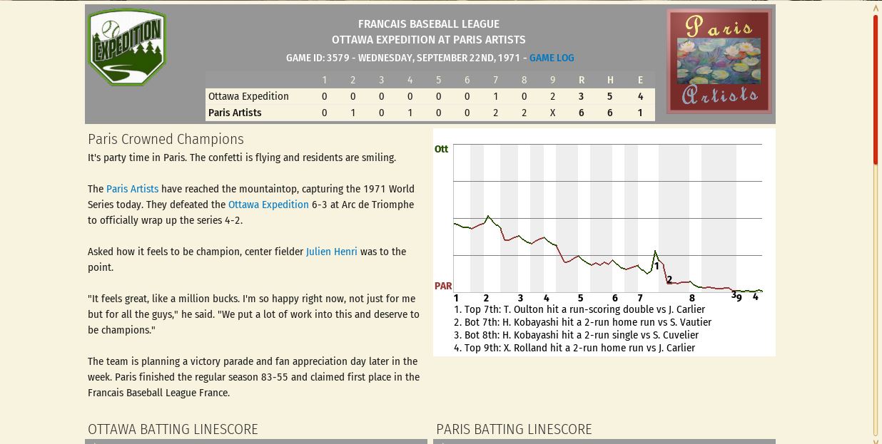 In the top of the first , Mathieu Michel took Corentin Chauvin's second pitch of the game and deposited into the right field seats.  The collective groan from the Expedition faithful was understandable given the nature of the series to date. With 2 out in the bottom of the first Douay singled. Xavier Rolland followed that up with a bee-bee to the left center field wall scoring Douay. In the bottom of the 3rd, with one on and one out, SP Corentin Chauvin sent a 1-2 fast ball into the left field seats elevating the Expedition to a 3-1 lead. The crowd went nuts. Chauvin had an .821 OPS during the regular season so this was not unexpected on the part of the Ottawa fans. With a new sense of hope the Expedition fans were dismayed when Roger Lamy hit a 3 run bomb in the sixth to put the Artists up by a run. Ottawa stuck with Chauvin and answered quickly in the bottom part of the inning when Tim Oulton reached the seats with a 421 ft. fly ball on the first pitch from Hubert Rivet. That made it 5-4 Expedition. In the next inning Chene singled in one and Douay doubled in two more and Ottawa was on their way to a convincing 8-4 win to put some life in this series Julien Henri went 1 for 4 and logged an outfield assist (3rd base) in the losing cause for Paris.
