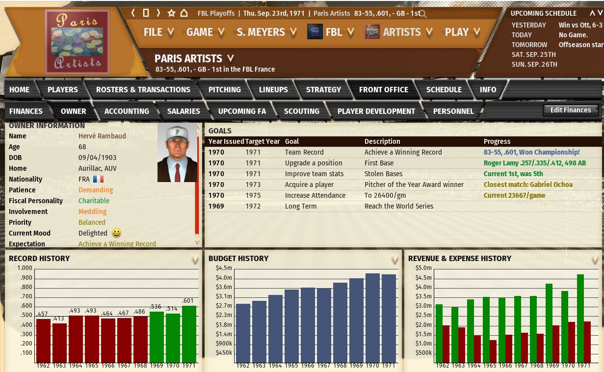 For the original owner of the Paris Artists, Herve Rambaud, this is his first championship.  While not all the goals were meant financially, the Artists clearly over exceeded Rambaud's on the field performance expectations.   It is probably no coincidence that the Paris turnaround began in earnest when Julien Henri and Herve Delage arrived on the scene in 1969. Michel and Mercier were clearly the players that gave Paris the assets to win the most games in the Francais Baseball League as well as win the Championship.