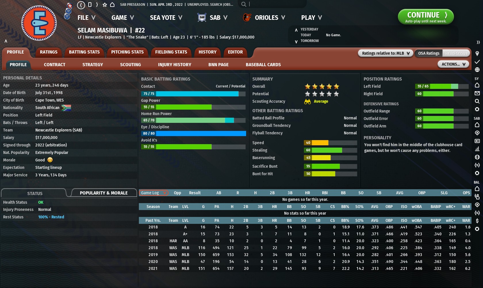 There is now: Hughie "Ferret" Kiume aka Mike Trout Yefu Adeboro aka Aaron Judge Selam "The Snake" Masibuwa aka Juan Soto Obviously these are extreme examples, but that was the point. I wanted to take some very big names that were guaranteed to be covered by the MLBPA license and show a big issue with the scrambler. Also, to the question why I loaded this up now, it's because I was planning out a fictional save and wanted to see which nations have highest quality of baseball in the game (to make leagues for). That was just the last save I had "played." |