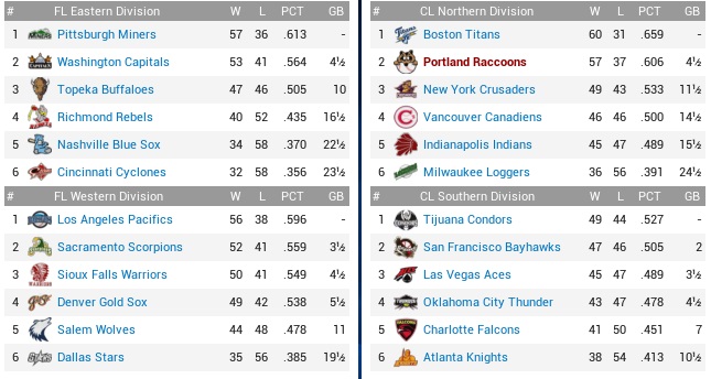 Tijuana's Shane Sanks was named the All Star Game MVP, going 2-for-4 with a solo home run in the Continental League's 2-0 win over the Federal League in Richmond. The Elks' Brian Wojnarowski drove in the only other run of the game. The Coons' Rin Nomura pitched one perfect inning for the win appearing right after Tijuana's Jeff Little held the FL scoreless to begin the game. Josh Boles and Ricky Ohl also had scoreless appearances. Billy Brotman did not pitch. Kevin Harenberg started the game at first base, but was 0-for-2 before being replaced by Pat Fowlkes. Rafael Gomez had an unsuccessful pinch-hitting appearance. Raccoons (54-36) @ Crusaders (48-40) July 15-18, 2027 The All Star break couldn't have been long enough for lineup as dead as the Raccoons' before the next series rolled around. Off they were to a 3-city road trip that would begin in the Northeast with a 4-game set against the Crusaders, who the Coons were up 6-2 against this season after taking three of four in the week prior to the All Star Game. All of that success had come before the Coons had been made complete laughs by the Elks on the weekend, and didn't count anymore. Runs counted and the Coons weren't scoring any. They had dropped to sixth in runs scored by now, while the Crusaders ranked first. Their pitching was still miserable, with the second-worst rotation and the fifth-most runs conceded overall. Projected matchups: Mark Roberts (8-3, 2.81 ERA) vs. Mike Rutkowski (4-5, 5.60 ERA) Rico Gutierrez (5-8, 3.70 ERA) vs. Carlos Marron (5-2, 3.45 ERA) Dan Delgadillo (4-7, 3.04 ERA) vs. Doug Moffatt (9-5, 4.28 ERA) Rin Nomura (11-3, 2.71 ERA) vs. Chris Klein (11-5, 3.37 ERA) The exact order of their right-handers might vary, but they were all that: right-handers. No surprises expected here. While the Crusaders were still without Andy Schmit to begin the series, he was expected to return during the weekend. The Coons' Cookie was old. He was still listed as OUT to begin the series. Game 1 POR: SS Stalker CF Mora RF Gomez 1B Harenberg C Tovias LF Spencer 3B Nunley 2B Rock P Roberts NYC: 1B N. Ayala SS R. Allen RF Ellis C F. Delgado LF Espinosa 2B Ts'ai CF Shaffer 3B Kane P Rutkowski Both teams dropped the odd single here or there, but the odd single wasn't going to create a run unless paired with some extra-base prowess, and who was merrier than Mark Roberts in surrendering home runs? While that was certainly the booming question in my head, he held up nicely early on and the Coons were actually the first ones to get a ball in for extra bases when Abel Mora hit for a 1-out double in the third inning. Gomez flew out, but Harenberg got a ball into centerfield that allowed Mora to score with the game's first run, and the top of the order was on it again in the fifth inning when starting with Stalker they chopped off straight singles to run the score to 2-0 on Rafael Gomez' single to center. Harenberg grounded out, creating an open base at first that the Crusaders walked Elias Tovias onto to face the struggling Jarod Spencer yes, all the Coons were struggling. Spencer grounded a ball to Rutkowski for a sure out at home, and Nunley popped out to short as the misery continued unabated. Bottom 5th, Zhang-ze Ts'ai's leadoff triple signaled that the fun was due to be over. Roberts foolishly plated him with a wild pitch, then walked Nick Shaffer, who stole second and came around on two groundouts to tie the game. While resignation was hardly ever uncalled for with this summer's Raccoons, they actually moaned and scored again. Trey Rock hit a leadoff single in the sixth, was bunted over by Roberts, and scored on a Stalker single, and in the seventh inning Spencer reached base with two outs, nipped second base (his 13th base this year), then came home when Ts'ai could not reach Nunley's roller over the second base bag and it escaped for an RBI single, 4-2. Too bad Roberts got stuck in the bottom 7th; Shaffer hit a 2-out double and he lost Mike Kane on balls, bringing up Jose Gutierrez, old enough to have witnessed the first Spanish landing in Central America, as pinch-hitter for Rutkowski. That removed both starting pitchers; Kevin Surginer would be tasked with this batter, and rung him up with blazing heat. That solved the problem in this inning, but Billy Brotman created a new mess in the eighth in which Nelson Ayala and Felipe Delgado reached. Snyder replaced him with two outs and PH Jason Asay batting for Juan Espinosa, and four days after his infamous Sunday meltdown in Vancouver got the K this time. The Coons failed to tack on when Shaffer caught Nunley's soft fly to center in the top 9th, ending the inning with Greg Borg and Jarod Spencer stranded on the corners after a pair of singles off Steve Casey. That made the ninth Ricky Ohl's first appearance as official closer; he struck out Ts'ai and Shaffer before Kane reached on Stalker's throwing error. Oh please god no Shane Walter flew out to center to end the game. 4-2 Coons. Stalker 3-4, RBI; Mora 2-5, 2B; Gomez 2-5, RBI; Borg (PH) 1-1; Spencer 2-5; Nunley 2-5, RBI; Roberts 6.2 IP, 6 H, 2 R, 2 ER, 2 BB, 3 K, W (9-3); You would think that 15 base hits would yield more than four runs, but not when you mix in 14 singles. Only Abel Mora had that lone double. Matt Nunley livened up a 1-for-20 stretch with his pair of hits. Game 2 POR: SS Stalker CF Mora RF Gomez 1B Harenberg C Tovias LF Spencer 3B Nunley 2B Rock P Roberts NYC: 2B J. Gutierrez SS R. Allen RF Ellis C F. Delgado CF Hatley LF Espinosa 1B N. Ayala 3B Kane P Marron Tim Stalker reached on an uncaught third strike to begin the game, which was one way to make something happen. Abel Mora singled, and then Gomez popped out, Harenberg popped out, and Elias Tovias grounded out to short on a 3-0 pitch. Stay awesome, boys, stay awesome ! By contrast, the Crusaders leadoff single by Mummy Gutierrez, then a 2-out, 2-run homer by Felipe Delgado, and BAM a 2-0 lead. But leave it to the Coons even when the first bite was not very taste