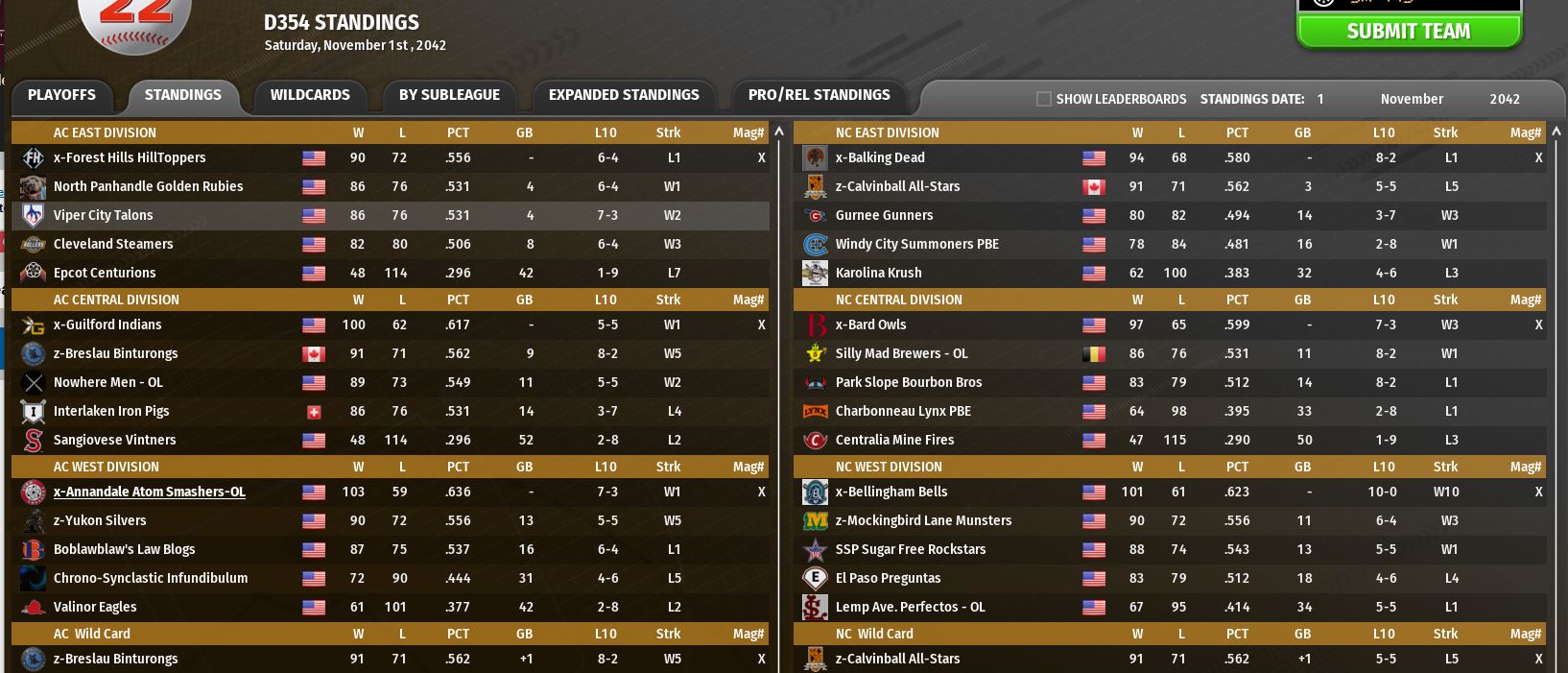 The Sunday Drivers ran away with the AC East title winning 122 games (7--3 in OL matchups) and are the number one seed heading into the playoffs. Regardless of playoff outcomes they will be promoted.