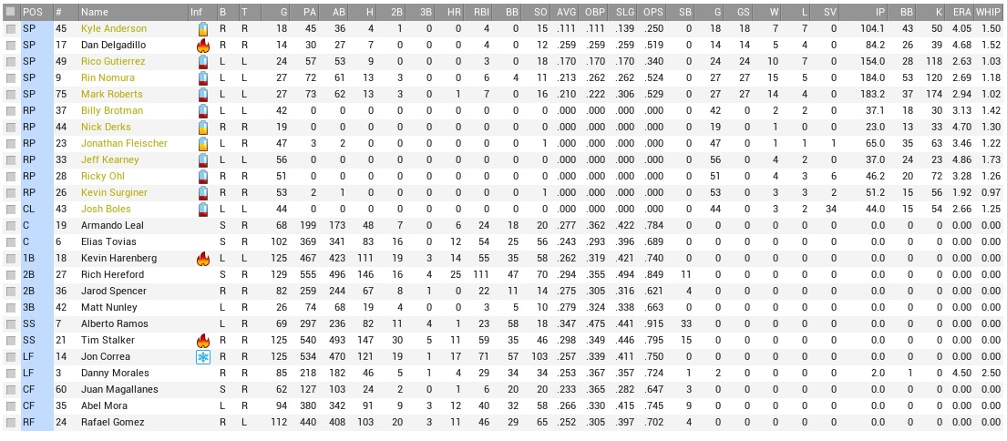 Portland Raccoons (98-64) vs. Topeka Buffaloes (90-72) Between games we finally got confirmation that Rin Nomura was not going to be available anymore. Poor sod had bone chips in his elbow and would have to be cut open. He would also be questionable for Opening Day, but that was a thought for a different time. Right now the Coons needed to find a pitcher SOMEWHERE. Dan Delgadillo would get the Game 3 assignment, and after that we would play things by ear. If we’re up 3-0 we could easily go to Anderson and use Roberts on regular rest in Game 5. If we did not go up 3-0 I would read our alternative plan from the pattern of my tear stains on the pillow case. We did now have the chance to add a guy to the playoff roster, though. Dave Martinez, Billy Ramm, Jeremy Moesker, and Steve Costilow were all eligible as replacement pitchers. We went with Ramm eventually because he had swingman potential and could pitch long relief if Anderson would make the Game 4 start. Game 3 – Dan Delgadillo (8-4, 4.89 ERA) vs. Nick Danieley (13-10, 3.48 ERA) POR: SS Ramos – 2B Stalker – CF Mora – LF Hereford – 1B Harenberg – RF Gomez – 3B Nunley – C Tovias – P Delgadillo TOP: CF Coleman – C Gio. James – SS Majano – 1B Elder – RF Benson – 3B P. Green – LF Hess – 2B M. Green – P Danieley The Coons only had a Gomez walk after two innings, while the Buffaloes had already packed the bases in the bottom 2nd. Elder and Pat Green hit singles; Ken Hess struck out for the second out, and then Delgadillo surrounded Mike Green’s grounder… and flubbed it for an error. That loaded them up for Danieley, who went down on strikes, but I had felt easier in previous playoff games… Not necessarily this season, though. The Raccoons didn’t get a hit until the fourth inning. Stalker opened it drawing a walk in a full count, but was forced out on Mora’s grounder. Abel legged out the return throw, however, and then we finally broke into the H column when Rich Hereford announced that he was still in the lineup and hit a 2-run blast to left that did a good deal of silencing the heretofore rather riotous crowd. Harenberg singled after this, but was stranded, and the Coons had Ramos on with a 2-out walk in the fifth, but Stalker’s deep fly came down over the warning track and into Benson’s mitten to end the inning. And Yusneldan? I did hardly dare to watch, but he was nursing a 3-hitter and did not create much in terms of panic through five innings, and had also rung up five to that point. He almost looked like the good pitcher he had been in the 2026 playoffs! The Raccoons struggled with offense still; they had only two base hits off Danieley through five, but the right-hander offered a walk to Hereford with one out in the sixth, then hung one to Harenberg that was never seen again, but estimated at 440 feet off the batter’s eye. That one ran the score to 4-0 and the Buffaloes were really in trouble now. Gomez and Nunley took to the corners with singles, but Tovias hit into an inning-ending double play instead of delivering the knockout blow. So they would get chances to crawl back into the game. Delgadillo had a calm sixth, but the seventh began with a Benson single to right-center. Pat Green spanked a bouncer to the hot corner, where Nunley whirled around to make a fabulous play to get the lead runner, but the return to first was not in time, and the Buffs were on the corners when Ken Hess singled. Mike Green was batting well under .200 and was a right-hander and we were willing to leave Delgadillo in (you also don’t want to overwhelm Ohl and Surginer, and this was not a spot for f.e. Nick Derks…). He secured an easy fly to shallow right from the latter Green, no chance for the former Green to score, and then the Buffaloes sent .176 batter Ron Raynor to pinch-hit. This was probably Delgadillo’s final batter. At 88 pitches and with left-handed bats after that, this was the one he could lean into and give his all for one final time. The count ran full, but Yusneldan prevailed and rung up Raynor, keeping the 4-0 score intact through seven! Portland added on in the top 8th against righty Mike Willis’ first appearance of the postseason. He conceded a run on three soft singles by Hereford (who was forced out by Harenberg), Nunley, and Tovias, the latter scoring a run with his roller past Pat Green. Jon Correa batted for Delgadillo, but grounded out. Kearney and Fleischer pieced together the bottom 8th, which saw James work a walk against Kearney, but the Buffaloes then popped out twice against Fleischer. We continued to play this one by ear in the bottom 9th and just left Fleischer in there for now in a part of the lineup that alternated the handedness of batters anyway. Benson grounded out to short. Green grounded out to short. Hess popped it up over the infield, slammed down his bat in anguish, and sunk to his knees even before Matt Nunley caressed the pop that sent the Coons up 3-0. Raccoons 5, Buffaloes 0 – Raccoons lead series 3-0 Hereford 2-3, BB, HR, 2 RBI; Harenberg 2-4, BB, HR, 2 RBI; Nunley 2-4; Delgadillo 7.0 IP, 5 H, 0 R, 0 BB, 7 K, W (1-1); Fleischer 1.2 IP, 0 H, 0 R, 0 BB, 0 K; Game 4 – Kyle Anderson (9-8, 4.70 ERA) vs. Ernesto Lujan (13-14, 3.30 ERA) Roles were defined here. The Raccoons could afford to send out Kyle Anderson for their first matchball serve, because they knew they would have rested versions of Mark Roberts and Rico Gutierrez down the road. The Buffaloes had no such luxury. They went right back into the good stuff. Only once did the Raccoons win a playoff series in a sweep – the 1996 CLCS against the Aces. The Raccoons have NEVER lost a Game 7. POR: SS Ramos – 2B Stalker – CF Mora – LF Hereford – 1B Harenberg – RF Gomez – 3B Nunley – C Tovias – P Anderson TOP: CF Coleman – C Gio. James – SS Majano – 1B Elder – RF Benson – 3B P. Green – LF Hess – 2B M. Green – P Lujan This would not be a coaster. Anderson got swamped rig
