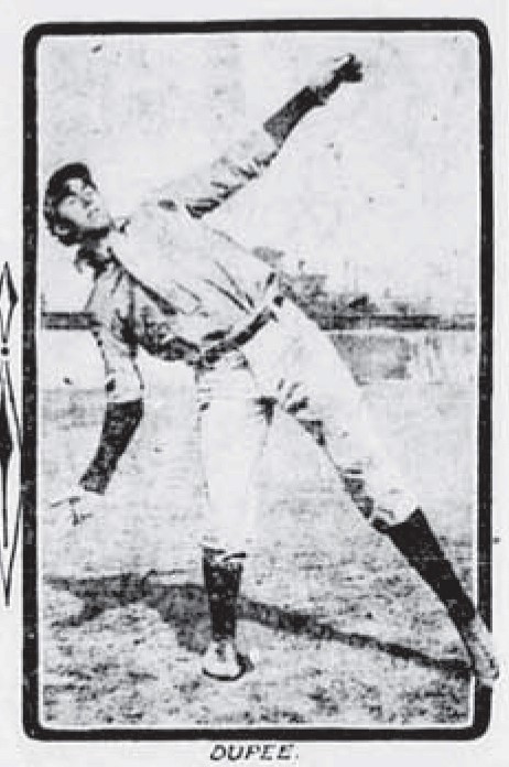 Dupee's major league debut occurred on August 24, 1901, when he was the starting pitcher for the Chicago White Stockings in Baltimore. He walked the first three batters in the game and then was pulled by Manager Clark Griffith in favor of Jimmy Callahan. All three runners scored, and Dupee was sent back to the minor leagues without getting another chance with the White Stockings. In the spring of 1902 (when this picture was published), he trained with the New York Giants, but sustained an arm injury and did not make the team. He pitched in the minors for another thirteen years, but his major league Earned Run Average remained at infinity. |
