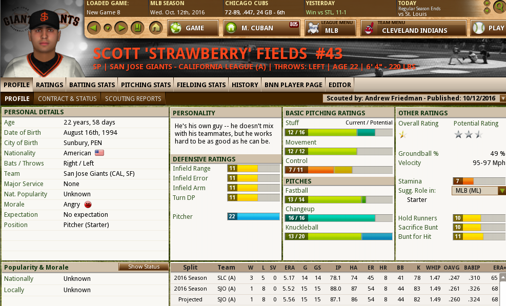 Most teams operate with scouting set to "normal" so it's difficult to gauge talent, hence the players drafter later get "rushed" and tend to lump a bit. This adds a lot more variability to the game -- it's sort of like real baseball.. I think Rusty, along with most guys, will make the majors -- albeit I don't see him playing a real "star" role. It's really difficult to gauge his talent as the Poet adjusts to being a reliever -- it wouldn't surprise me if he has two + pitches, but his third lumps, and he ends up a + bullpen arm.