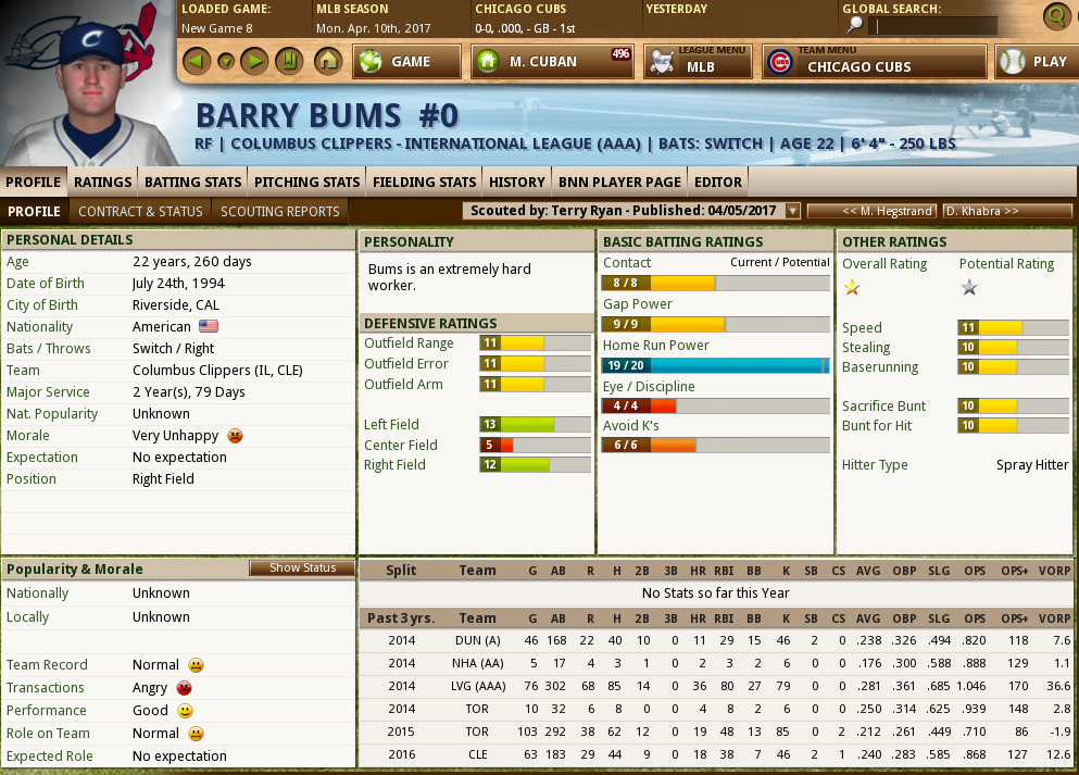 ![]() *As of 4/15/13, Bums is now third string for the AA Affiliate, Akron Mike Carp, the starting Left Fielder for Cleveland strolled up to the plate 207 times, hit 8 Home Runs, and accumulated a WAR of 11.1 in 2016. Barry Bums, the [former] starting Right Fielder for Cleveland, only saw 183 At-Bats in 2016, yet smashed 18 home runs and had a WAR of 12.6. It's clear this is a move of spite after RF Bums was benched for the second half of the 2016 season. Bums is unhappy with his treatment, and he's being buried in the Minors for being unhappy, which is going to cost Cleveland wins this season. It really isn't fair.