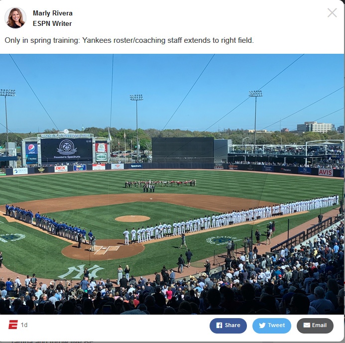 Yeah, thank goodness for that "Last Page" link. ![]() Okay, nothing new new on the injury front, thank goodness. But, ST starts today! (For me, anyway - the first telecast from Fla.!) EDIT: Ooops, Severino is new. My Yankee fanhood is rusty from the winter! Hopefully that's not serious. Also, there is this tidbit: "Outfielder Aaron Judge has also been dealing with shoulder discomfort and has not taken batting practice yet this spring." EDIT 2: Watching the telecast now, I am reminded that Didi is no longer with the team. I am going to miss him. Yes, the team may have been leery of his coming back from Tommy John and they have a surfeit of good infielders now (Torres, LeMahieu, Urshela, and Andujar) but Didi was a spark plug and a good team member.
