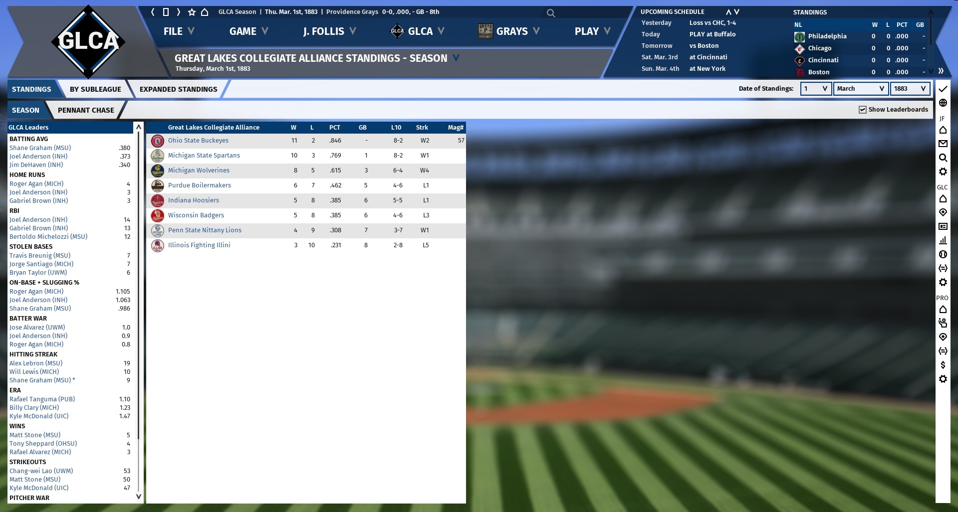 Game-predicted 1883 regular-season final standings on Opening Day for all NACSA-affiiliated college leagues. That is all. CD out.
