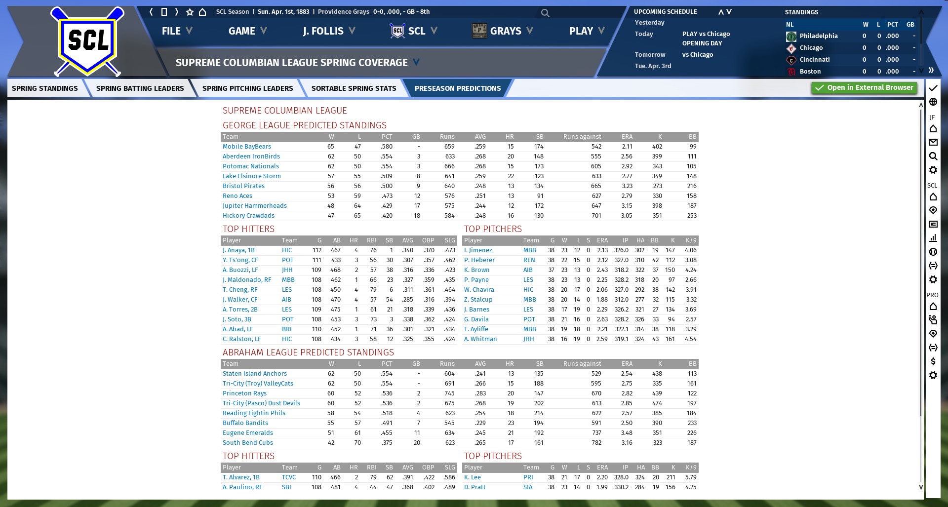 Current standings in multiple leagues, as of April 1, 1883. That is all. CD out.