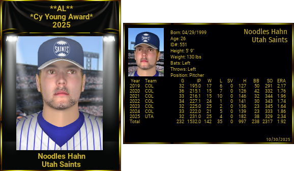 The highlight of the day was 5 time Cy Young award winner Noodles pitching a masterful 1 hit shutout at home against the Barcelona Magicians. Hahn who won 25 games in 2025, fanned 12 and only allowed a first inning single to Harmon Killebrew who was making his Barclona debut after 7 seasons with the Minnesota Twins. Killer said this "Utah eliminated Minnesota last year at the same ballpark, so I sign 7000 miles away with a team from Spain and still open up in Salt Lake and have to see that pitcher again... not fun" Utah got 2 hits and 2 RBI's from Matt Chapman and 2 hits from Yoan Moncada in his Utah debut. The Branson Jackals got bad news on pitcher Cal Quantrill who has been out a while and now will be out another 6 months with his torn UCL. Branson was counting on Quantrill to be in the rotation by late April and now his season is lost again. |
