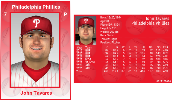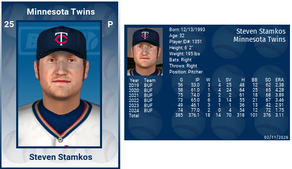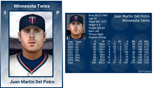 The Shreveport Sting announced today that reliever Aaron Fultz will retire at the end of the season at 36 years old Fultz has appeared in 328 career games mostly with the Kansas City Royals from 2019-2023. Fultz has appeared in two games so far this year for Shreveport. He is happy to finish his career in the south instead of Rome, Italy where he played last season Retirement news out of Maui, as pitcher RA Dickey will call it a career this year for the Maui Lobos. Dickey is 36 years old and feels that his knuckles are worn out. Dickey has a 21-68 career record and because of expansion has lengthened his career. He has played for a lot of teams, but most notably the Albuquerque Blackbirds from 2021-2023. He has not even thrown a single pitch in Maui yet but said this is the end. The Athens Odyssey are in their first season and they have already lost a player for the season. Rookie reliever and 9th round pick Brian Eversgerd is out for 5 months with a torn back muscle. He suffered the injury in a hard fought 2-1 extra inning loss to the Seattle Mariners on the road. It was bittersweet for Eversgerd as he was so excited to start his big league career with a team from Greece playing in Seattle, not too far where he grew up in Centralia. Trent Thornton won 19 games in 2025 for the Kansas City Royals but his 2026 season has already ended. He damaged his elbow ligaments on the road in an 11-3 beating by the Branson Jackals. Thornton lasted one inning and 16 pitches before complaining of pain. Royals will promote Lowell Palmer to take his spot in the rotation which is not comforting for Kansas City fans. In other injury news, the New York Mets have lost the service of 3B Bill Joyce for 7 weeks with a fractured ulna. Joyce is a solid bat in the Mets lineup with 90 homers over the past 3 seasons. Injury was in a dramatic game at Citifield against the Los Angeles Dodgers where Danny Coombs hit Joyce with the pitch with the game tied at 3-3, so probably not intentional. Next batter up is the man of dramatics, Bobby Thomson and he hits a walk off 3 run homer off Coombs to give the Mets the walkoff win. It appears Jared Sandberg will play 3rd base with Joyce out. |