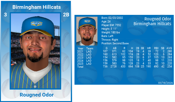 1. Rome Thoroughbreds Managed by: Joe Quinn (2nd season) Top Players: Jack Sanford, Wilson Ramos, Harry McCormick Top Prospects: Bill Dammann, Carl Sawatski, Freddy Galvis 2. Pittsburgh Pirates Last title: 1979 Managed by: Ronnie Courtney (7th season) Top Players: Jerry Nops, Gio Urshela, Ralph Kiner Top Prospects: Fred Mann, Jeff Heath, Sam West 3. Louisville Bats Managed by: Mike Zoeller (6th season) Top Players: Johnny Vandermeer, Heinie Manush, Ryan Braun Top Prospects: Bob Meusel, Jimmy Dykes, Henry Thielman 4. Binghamton Swallows (first season) Managed by: Zach Omlin Top Players: Danny Duffy, Bill Swift, Don Gross Top Prospects: Travis Jackson 5. Madison Monarchs Managed by: Gustavo Calderon (3rd season) Top Players: Carl Taylor, Ira Flagstead, Mellie Wolfgang Top Prospects: Joe Mauer, Jesse Hahn, Dennis Leonard 6. Chicago Cubs Last Title: 2016 Managed by: Brian Hay (1st season) was BC of Philadelphia Phillies from 2021-2025 Top Players: Bob Feller, Jumbo McGinnis, Vic Willis Top Prospects: Noah Syndergaard, Hank Robinson, Jim Lonborg 7. Cincinnati Reds Last Title: 2024 Managed by: Adam Sinatra (2nd season) Top Players: Roy Oswalt, Carl Lundgren, Larry Doby Top Prospects: Joe Magrane, Travis Fryman, Vern Ruhle 8. Grand Rapids Crawdads Managed by: Max Parker (4th season) Top Players: Birdie Cree, Dolph Camilli, Jack Flaherty Top Prospects: Walt Wilmot, Brook Jacoby, Ed Baecht 9. Mobile Swordfish Managed by: Nick Ross (4th season) Top Players: Jack Clements, Hughie Jennings, Irv Ray Top Prospects: Mike Moynahan, Daniel Robertson, Monte Cross 10. Aruba Jackrabbits Managed by: Tim Raynor (1st season) promoted from bench coach Top Players: Bill Swift, Van Mungo, Matt Wieters Top Prospects: Scott Sanders, Harry Decker, Wei-Yin Chen 11. Birmingham Hillcats Managed by: Sean Cain (3rd season) Top Players: Red Murray, Milt Pappas, Tony Conigliaro Top Prospects: Mike Trout, Mike Bruhert, Kyle Lohse 12. Lisbon Pipers (1st season) Top Players: Dean Stone, Rich Becker, Jaime Garcia Top Prospects: Zach Davies, Chip Hale 13. Milwaukee Brewers Managed by: Cesar Florez (3rd season) Top Players: Denny Lyons, Lady Baldwin, Henry Boyle Top Prospects: Rickie Weeks, Bernie Friberg, Darrell Evans 14. Morgantown Cottonmouths Managed by: Tom Halifax (2nd season) Top Players: Mel Parnell, Gene Krapp, Bob Forsch Top Prospects: Pink Hawley, Terry Pendleton |