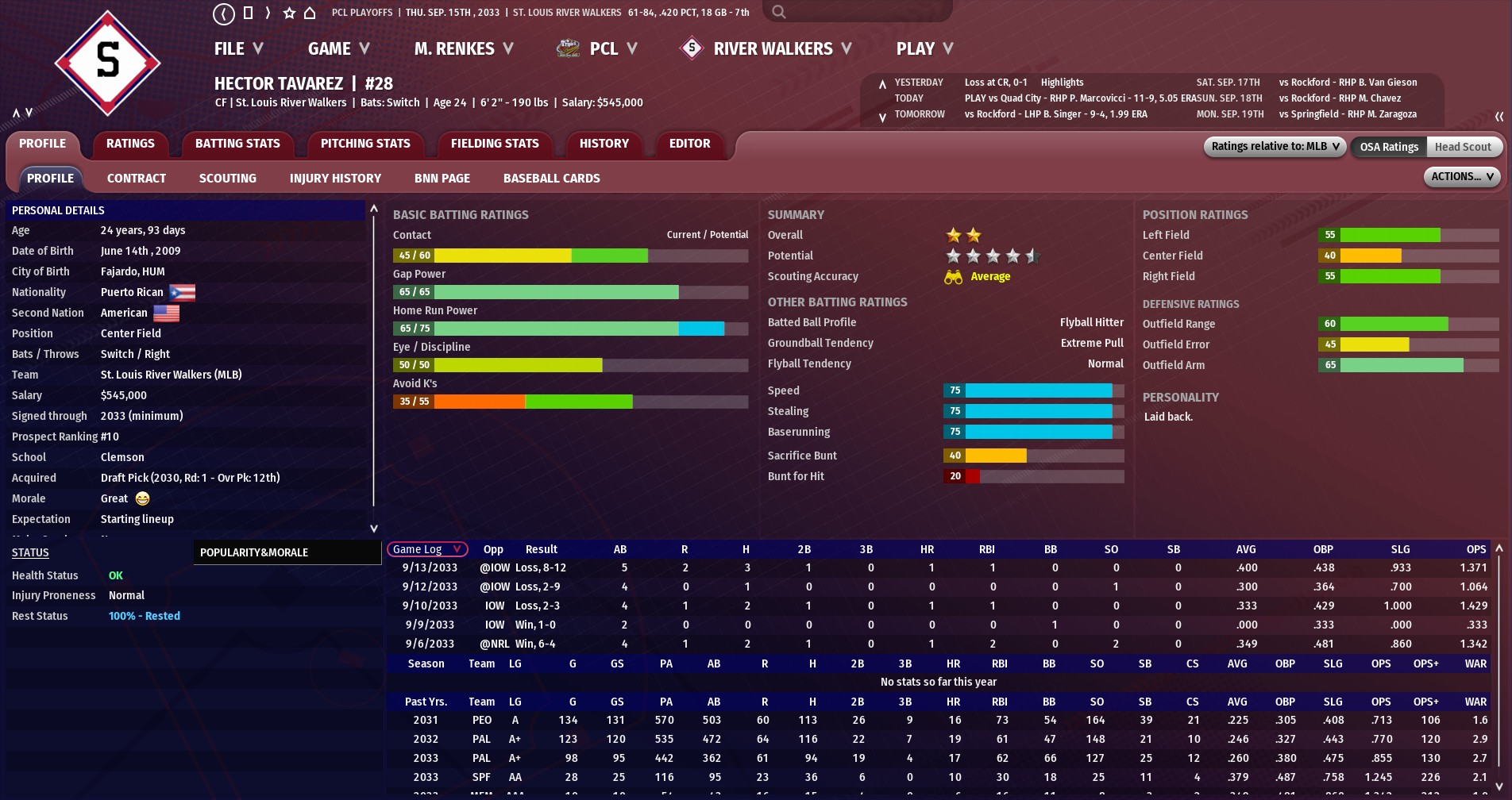 Meier and Tavarez were both playing for Memphis in the Pacific Coast League playoffs. The Redbirds lost to the Iowa Cubs in three games in the opening round, after posting a league-best record of 93-45 during the regular season. Meier, 29, was acquired from Fort Worth in the offseason with the hopes he could earn a spot in the rotation. But he struggled mightily in spring training, and was no better as a starter for the Redbirds. Meier eventually was turned into the Redbirds' closer, where he excelled. For the season, Meier pitched in 33 games/17 starts, going 1-5 with 11 saves (one blown save) and a 5.71 ERA. The top-ranked player in the Walker's minor-league system, and No. 10 in all of the MBL, Tavarez played at three levels in 2032. Tavare, 24, started at Class A Palm Beach, where in 98 games, he hit .260 with 17 homers and 62 RBIs. For AA Springfield, Tavares played 16 games, batting .379 with 10 homers and 30 RBIs. Tavarez played 10 games for Memphis, batting .349 with six homers and 16 RBIs. To make room for Tavarez, first baseman Rick Scott was placed on waivers. Scott, 29, who had a huge season at Memphis, played in 17 games for the Walkers, batting just .167 with three homers and six RBIs. |